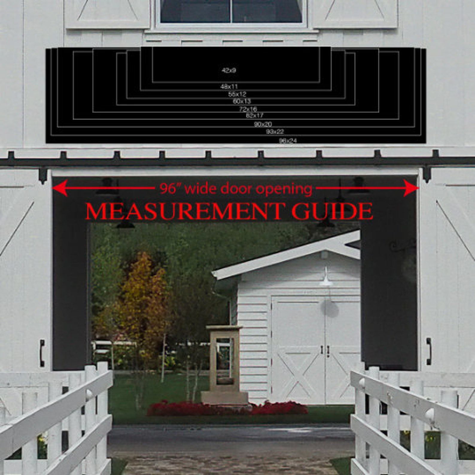 To order, measure your space carefully! We provide a sizing guide to help you get an idea of size in relationship to your barn door. Please view it.