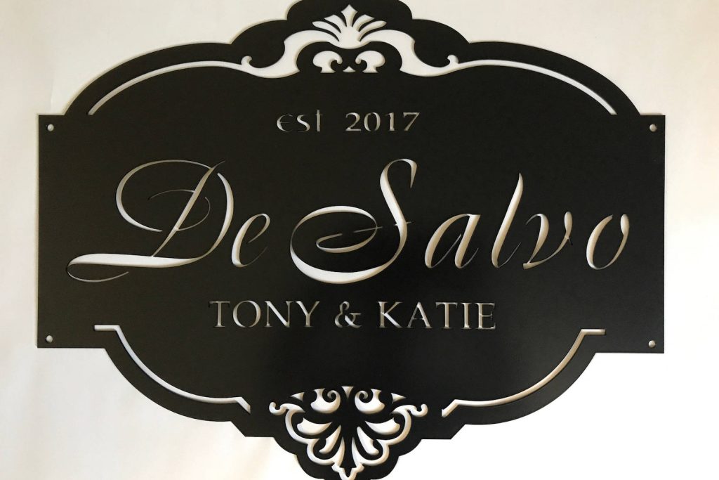 Metal laser cut sign personalized with your name finished in baked on black powder coat finish. measures 22"". Makes a very elegant statement to your front entrance. You can also add first names or Est. date Our finish is a baked on powder coat for extremely durable, long lasting finish