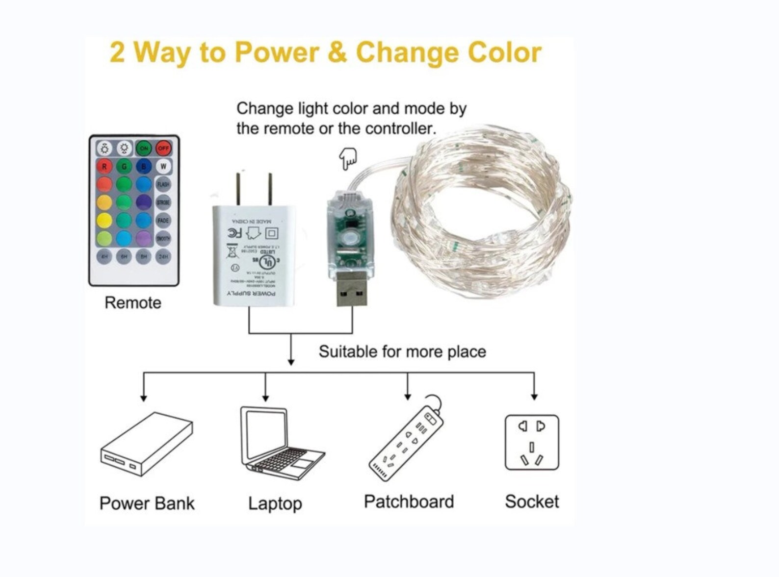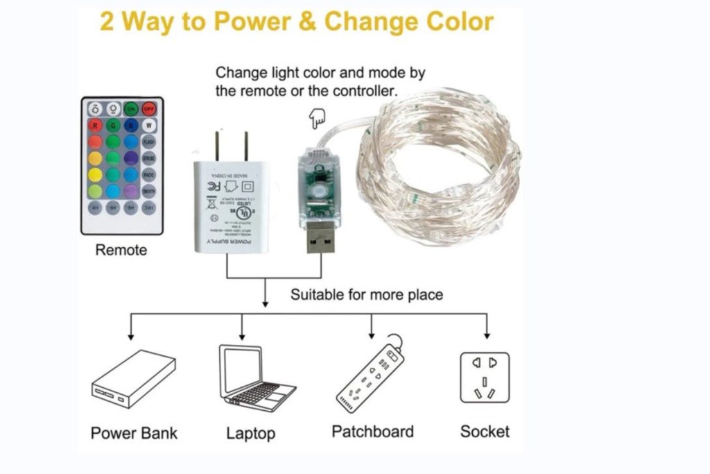 The USB plug enables you to plug the string of LEDs into a USB hub, and a power adapter, and you can go to the store and buy a CR2025 type button cell battery.