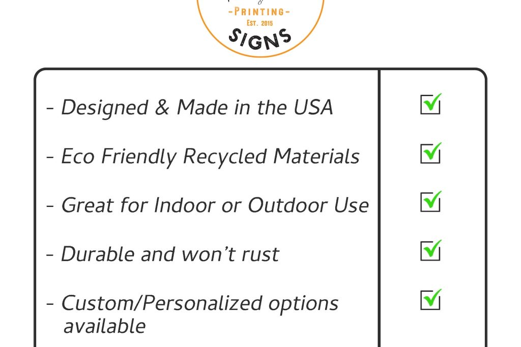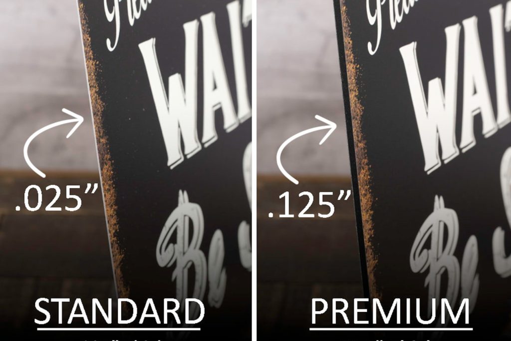 -PREMIUM options are crafted from 100% recycled Aluminum Composite panels that are .125" thick. Aluminum composite panel is comprised of a reinforced synthetic core sandwiched between two sheets of aluminum. The benefits of this material is that it9;s more rigid yet lightweight making it easy to hang and it9;s 100% recycled.