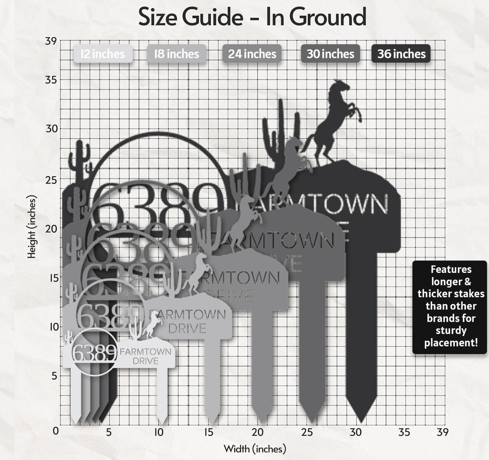 In Ground: These signs come with two strong stakes for easy placing in the ground. Our stakes are longer and wider than competing brands, meaning you have more freedom to let your sign sit as low or high off the ground as you want, with confidence it will reliably stay in place. Refer to sizing images to see how long the stakes are for every sign.