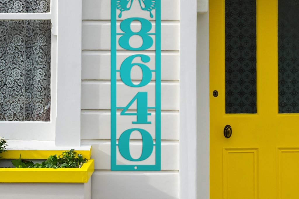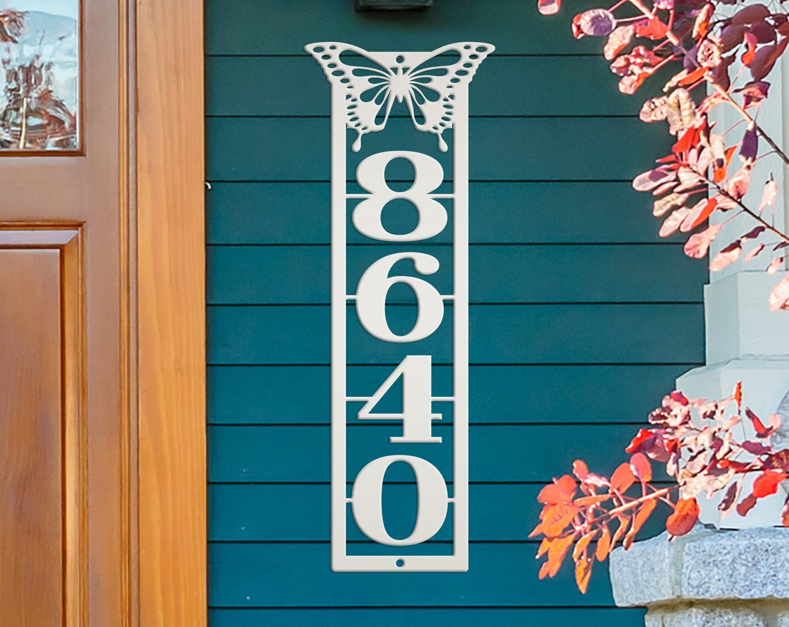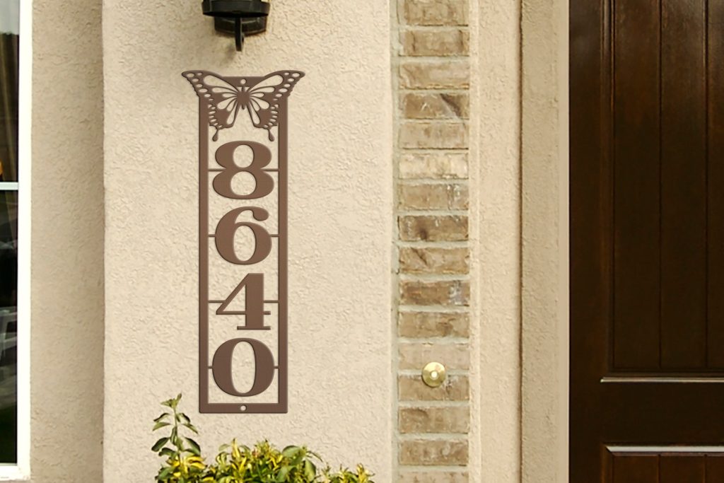 Introducing our beautifully crafted Metal Address Sign! Enhance your home or business with this exquisite Vertical House Numbers Plaque featuring a stunning Detailed Butterfly design. This versatile piece can be easily displayed on your Mailbox Post, used as a Home Marker or even as striking Business Wall Decor. Make a statement and impress your guests with this elegant addition to your Front Porch. Perfect for both personal and HOA use.