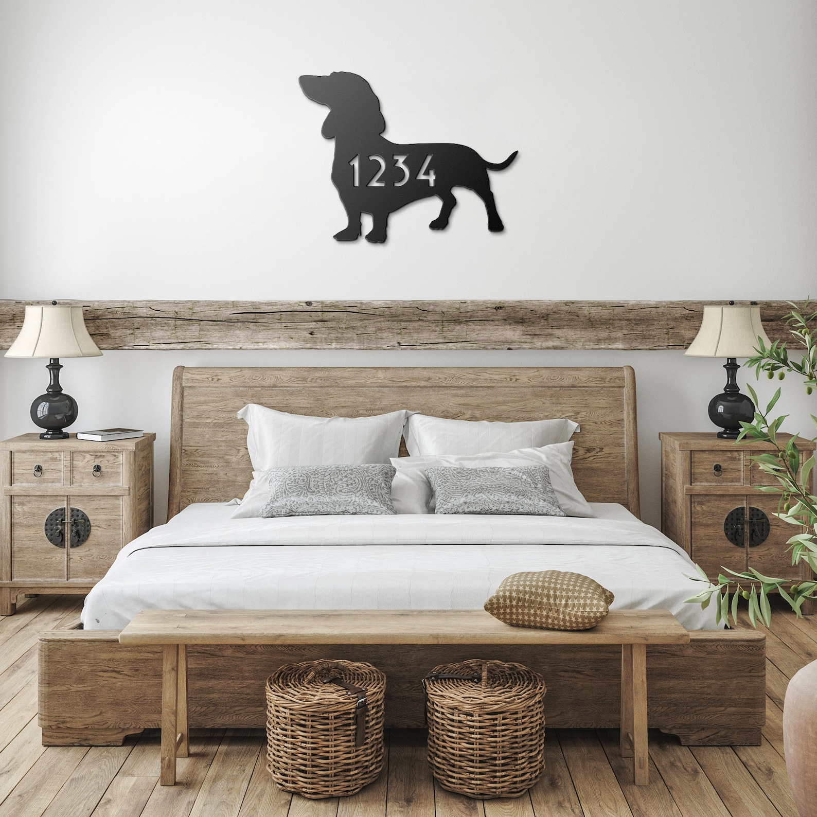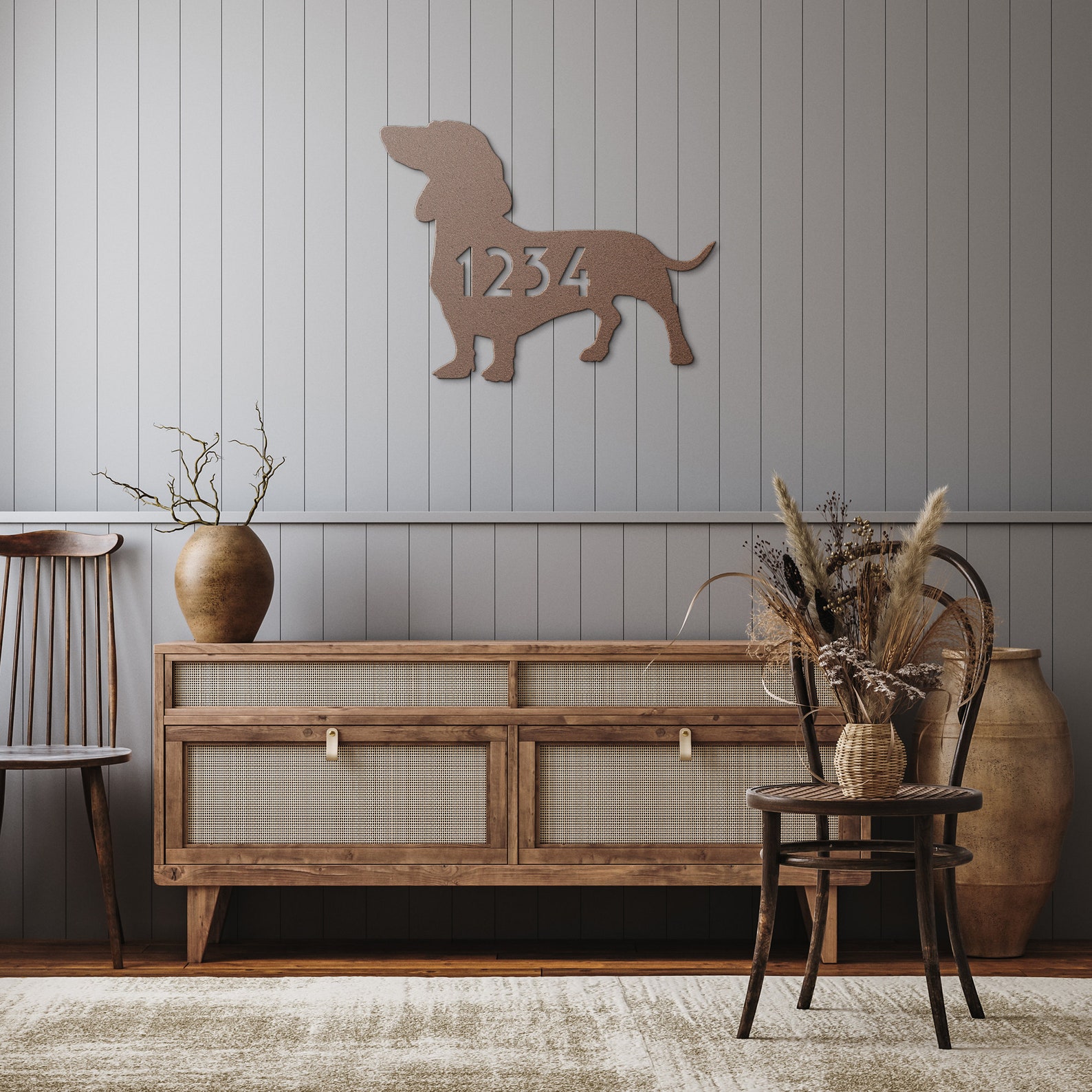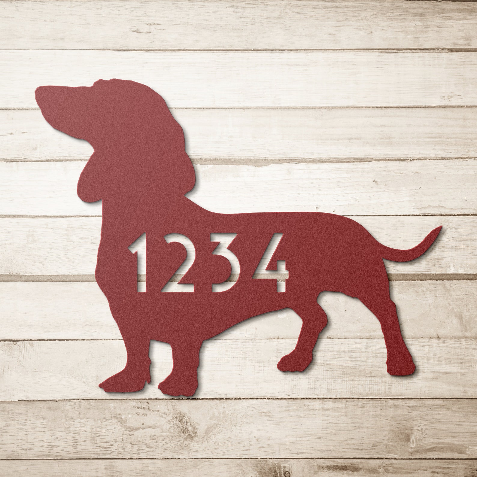 Personalize this Dachshund Dog Address sign with up to 4 numbers in the personalization box when you order. Made with 18 gauge steel and powder coated in your choice of 5 colors, this sign is built to withstand the elements for years of enjoyment. Add a touch of elegance to your home on the inside, outside, or both!