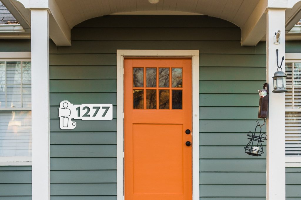 House numbers with extra expression, this one has the numbers in a long (or short depending on the address) lens camera. Great gift for photographers. I am an artist and designer and I designed these in Adobe Illustrator at home (cat by my side). After you place your order I will send you a mock up so you can see how your words look in the design. Upon approval I will send the file off to Teelaunch, my production partner, where they will cut your sign out of 18 gauge steel and powder spray coat it so it ends up feeling sort of like cast iron but it9;s much thinner, a little thinner than a quarter but strong. Their production time is 5-7 days which means that you should receive it in about 10 days unless it9;s holiday rush time in which case it will probably be 2 weeks.
