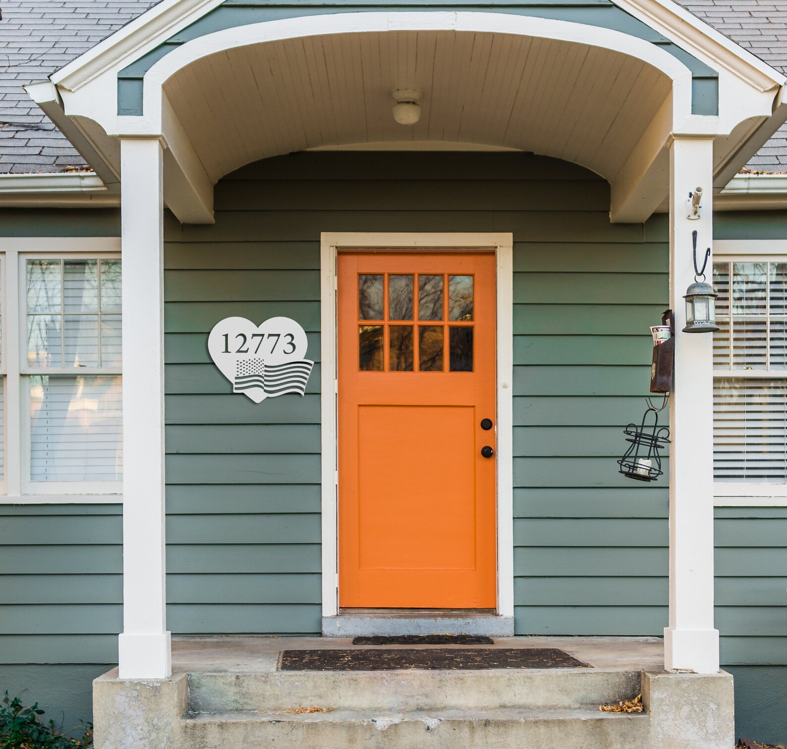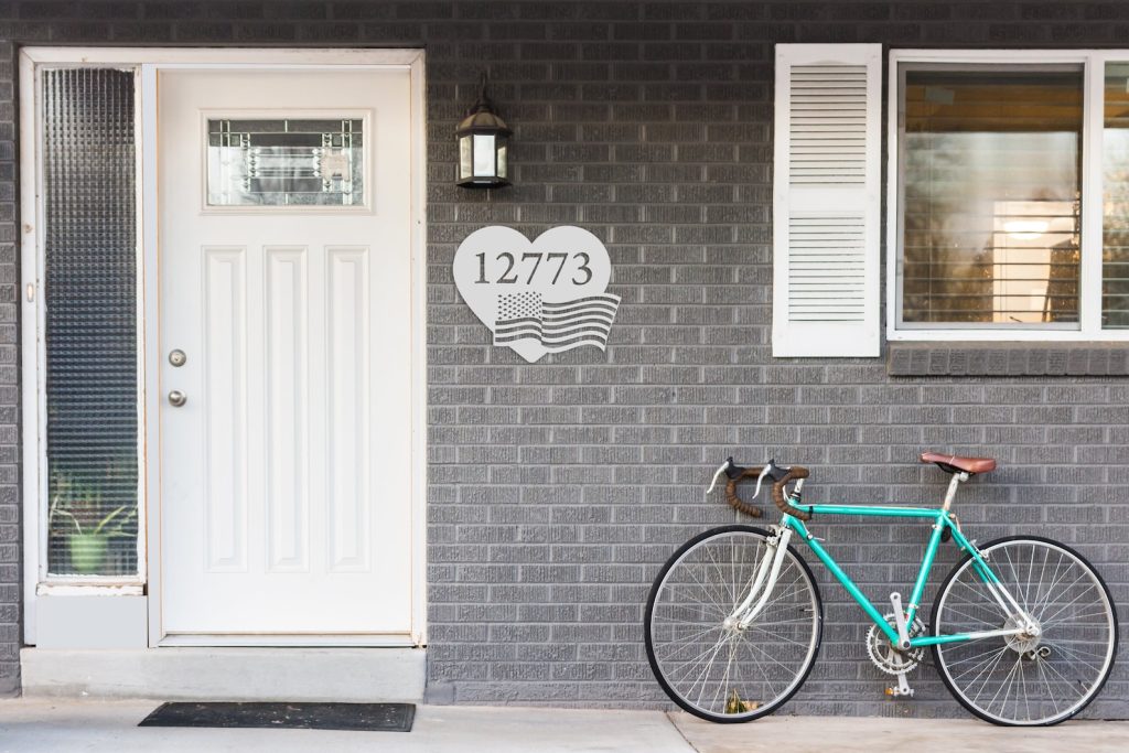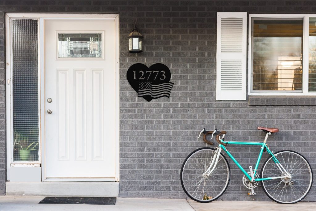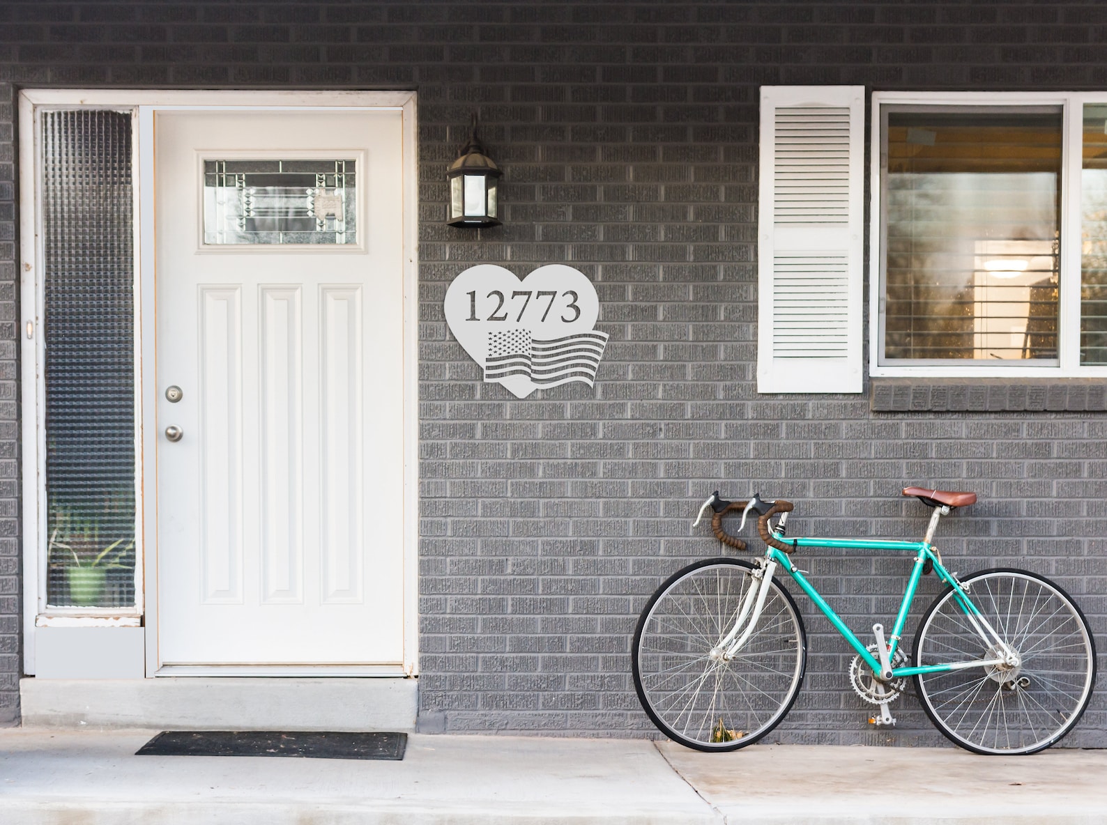 House numbers with extra expression, this one is just a simple heart with an American Flag. I am an artist and designer and I designed these in Adobe Illustrator at home (cat by my side). After you place your order I will send you a mock up so you can see how your words look in the design. Upon approval I will send the file off to Teelaunch, my production partner, where they will cut your sign out of 18 gauge steel and powder spray coat it so it ends up feeling sort of like cast iron but it9;s much thinner, a little thinner than a quarter but strong. Their production time is 5-7 days which means that you should receive it in about 10 days unless it9;s holiday rush time in which case it will probably be 2 weeks.