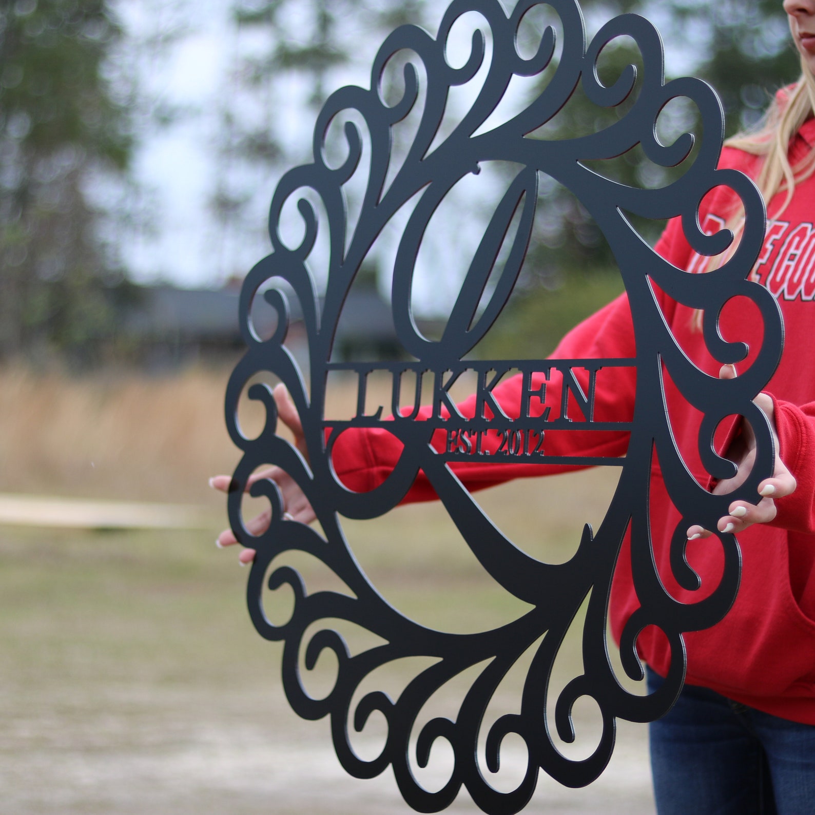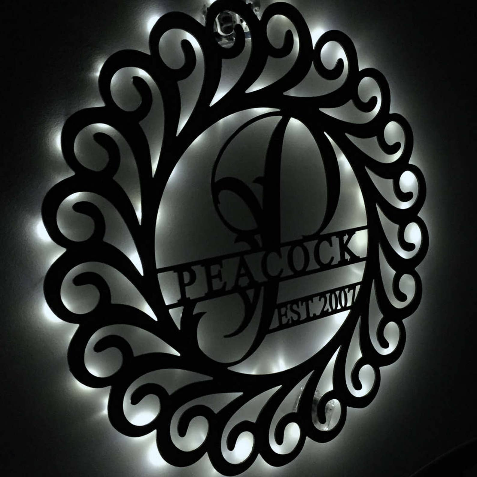 Our beautiful personalized aluminum decorative custom metal signs are made to last. The material we use is an aluminum composite panel which is a multi-ply lightweight yet durable choice for custom signs. This abstract metal sign features your last name, big initial, and date established whether it9;s your wedding date, anniversary date, or any special day. Perfect housewarming gift! This is an original design and the finished sign measures approx 30" x 30" We offer several different finishes and no mounting hardware is incl. You could also add lights to this if you prefer as shown in one of the photos. We mounted this sign on our privacy fence which really added a very unique personalized touch to our outdoor fence decor. It could easily be mounted or hung on a wall or door too! We also offer custom aluminum signs.