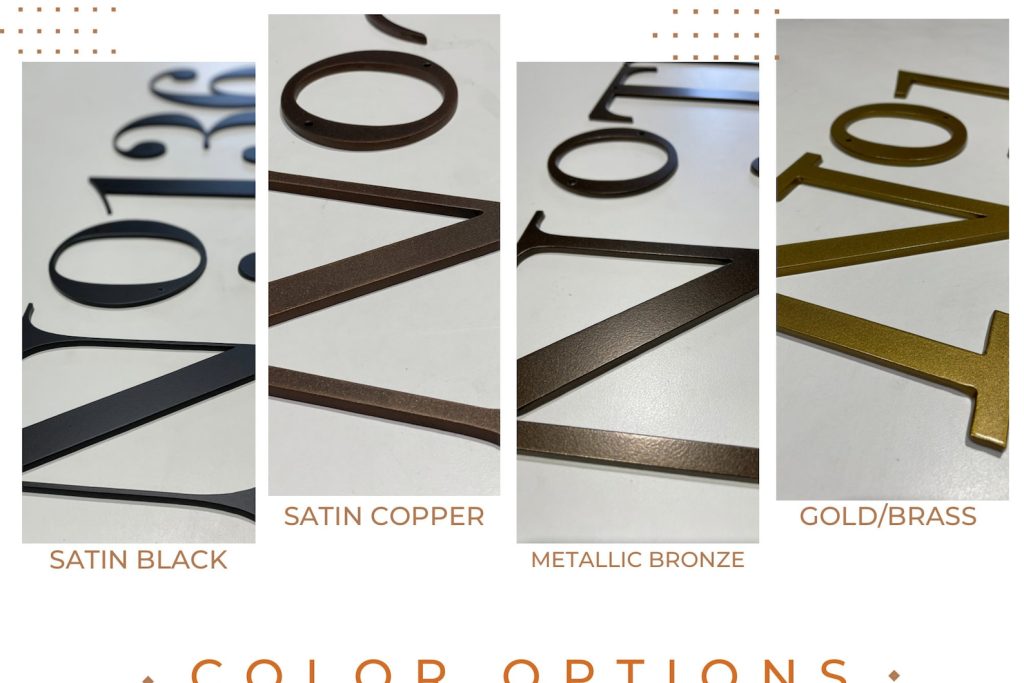 These numbers come with our premium exterior grade powder coating. Our standard colors are Satin Black, Satin Copper, or Metallic Bronze.