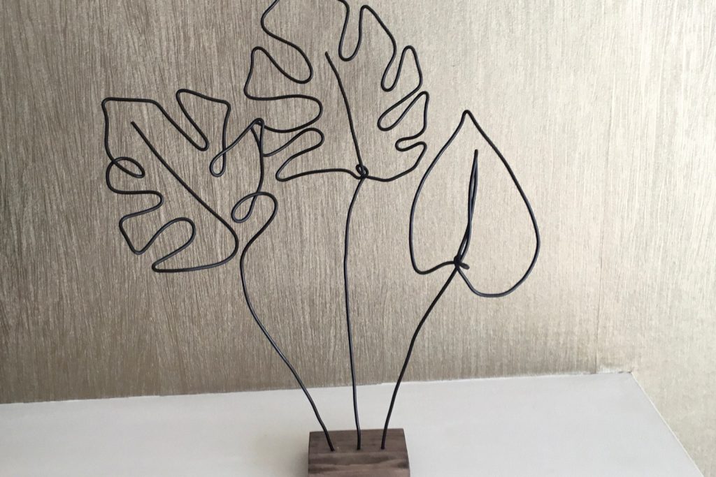 Unique free standing wire leaves. This shelf decor can be made in a choice of 4 colours. It is hand formed from sturdy 3mm aluminium wire.