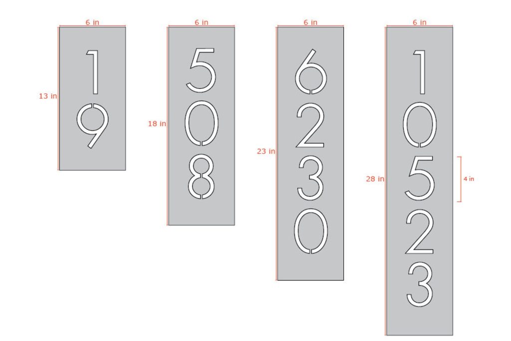 – The dimensions of your plaque will vary according to the number of digits, which are center-aligned. Please scroll through the pictures above to see the different dimensions. If you need a custom size, feel free to shoot us a message.