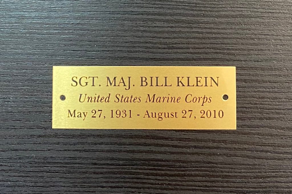Custom engraved gold metal plate that laser engraves your personal text in black. Perfect personalized plate for trophies, paintings, frames, taxidermy, urns, gifts, flag boxes, and more.