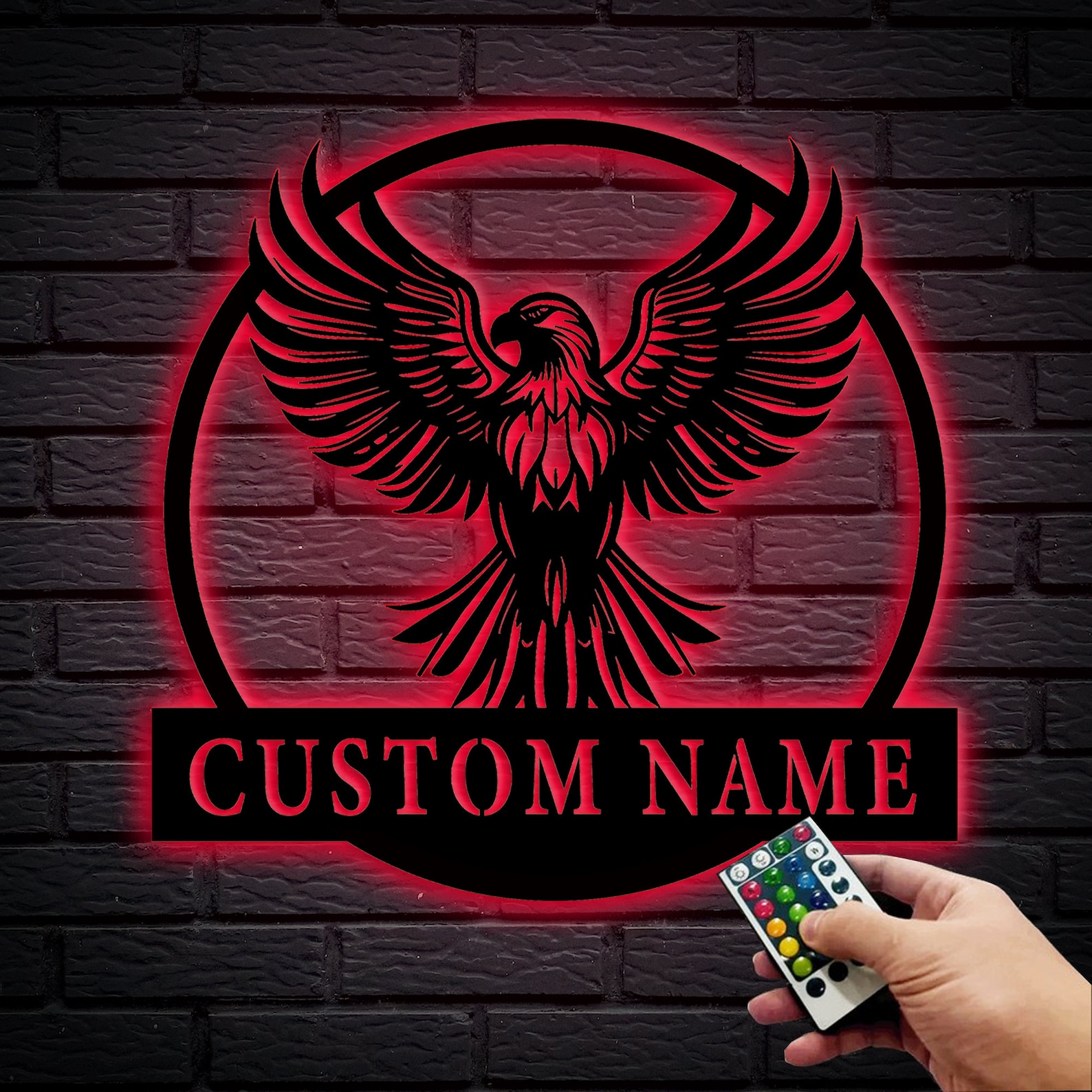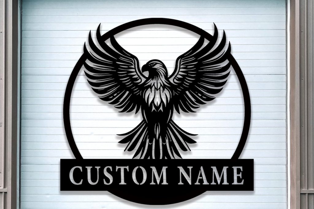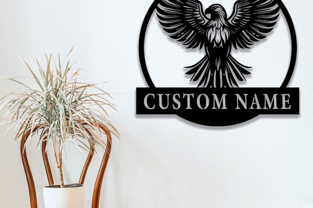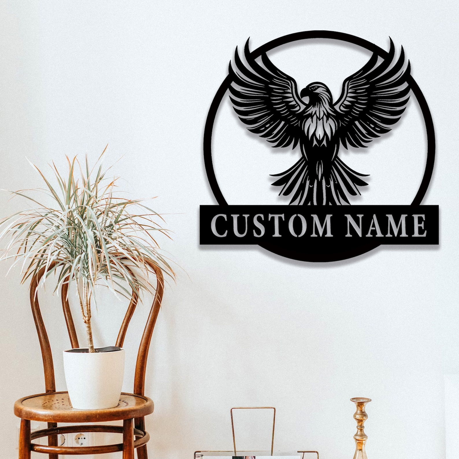 Add personality and artistic beauty to your space with this custom bald eagle metal wall decor. Each wall decoration can be paired with your personalized bald eagle name logo to make your space unique.