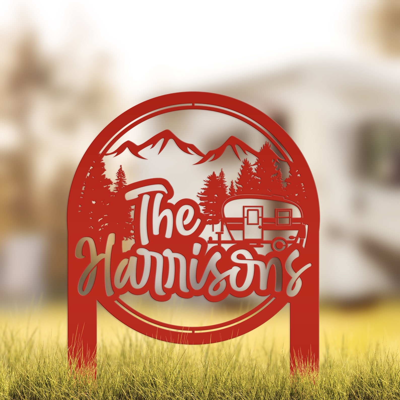 This metal camping sign is personalized with your family name. It is perfect for outdoor campsites and makes a great gift for weddings or any other special event. This sign can also be used as a decoration in your RV park or camper.