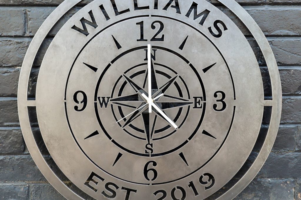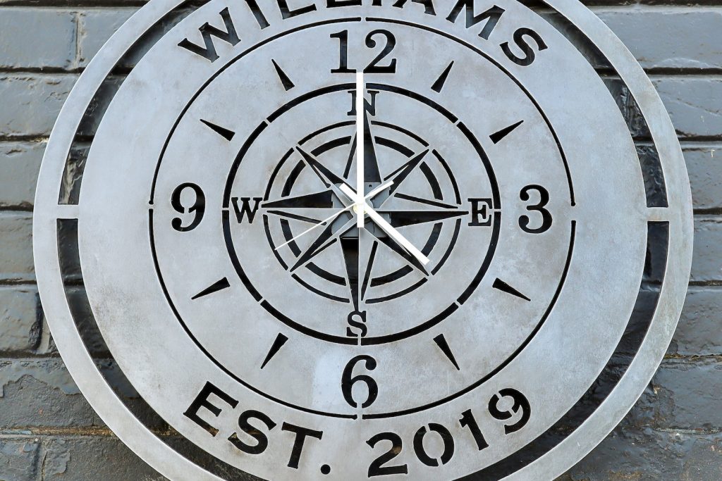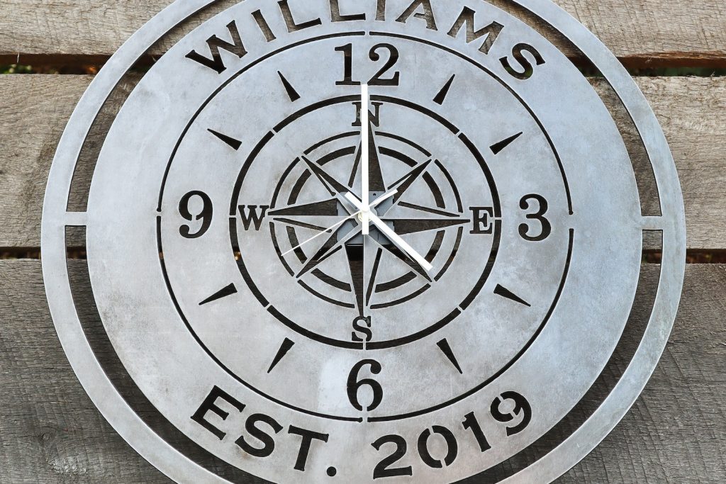Let this personalized metal wedding clock add some nautical charm to your home. This rustic steel clock with a compass rose design and your family name is the perfect piece to add some decoration and functionality to your wall. Don9;t let time be a bother any longer!