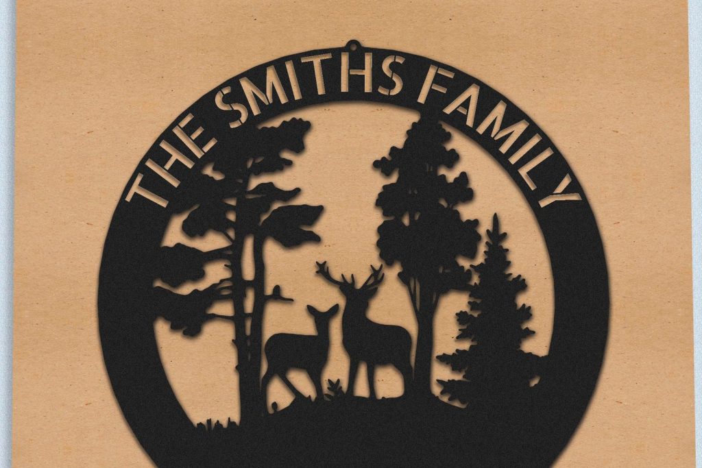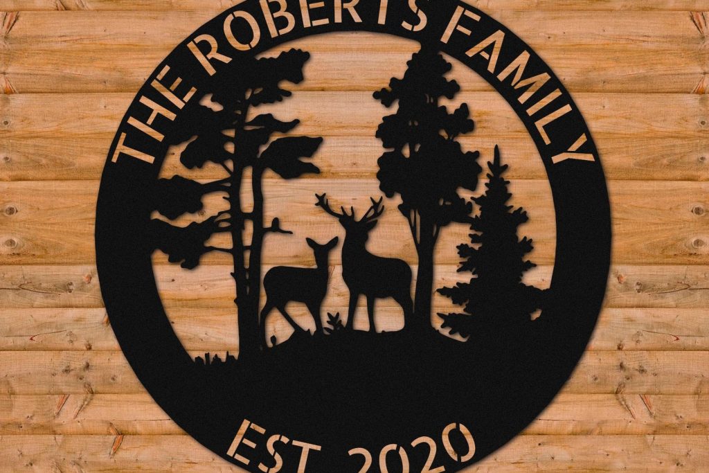 At the heart of this stunning sign is a silhouette depiction of a family of deer, gracefully moving across a serene forest landscape. The intricate design showcases the unity and harmony of these majestic creatures, while the backdrop of the forest transports you to a tranquil woodland setting.