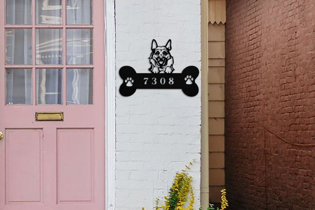 Horizontal Dog Silhouette Address Sign. Made with 14 gauge American made steel and powder coat to help prevent rust and discoloration. Made from high-quality metal, our custom address sign is durable and weather-resistant, ensuring that it will last for years to come. The sign can be customized with your address or any other text that you choose, making it a truly unique and personalized addition to your property. It can be used as a family property to last for generations.