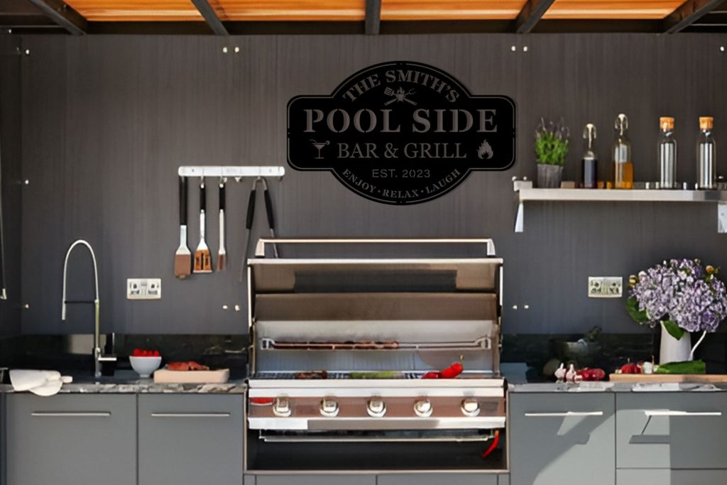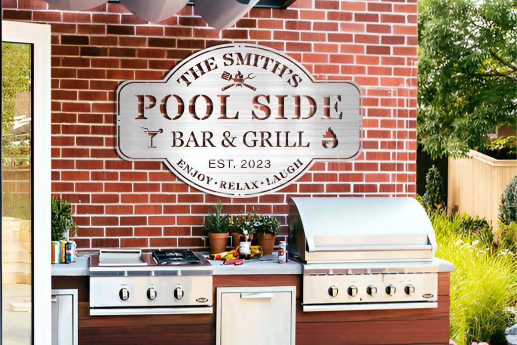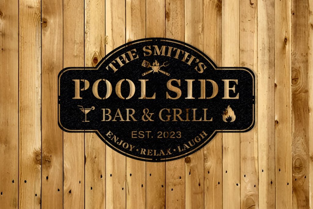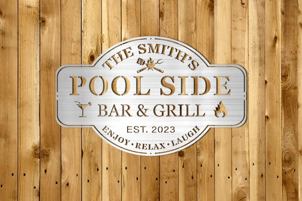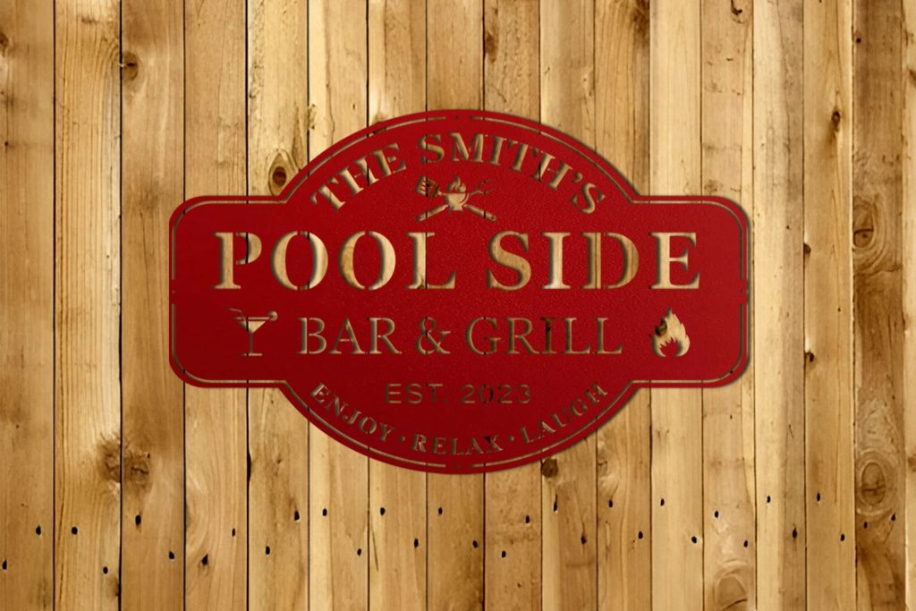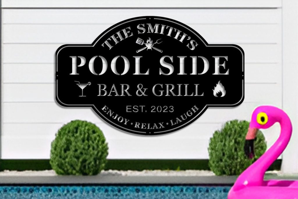Personalized Metal Family PoolSide Bar and Grill Sign,Pool and Bar, Tiki Bar, Bar and Grill, Pool Oasis Personalized Sign for Pool Bar Patio Decor
