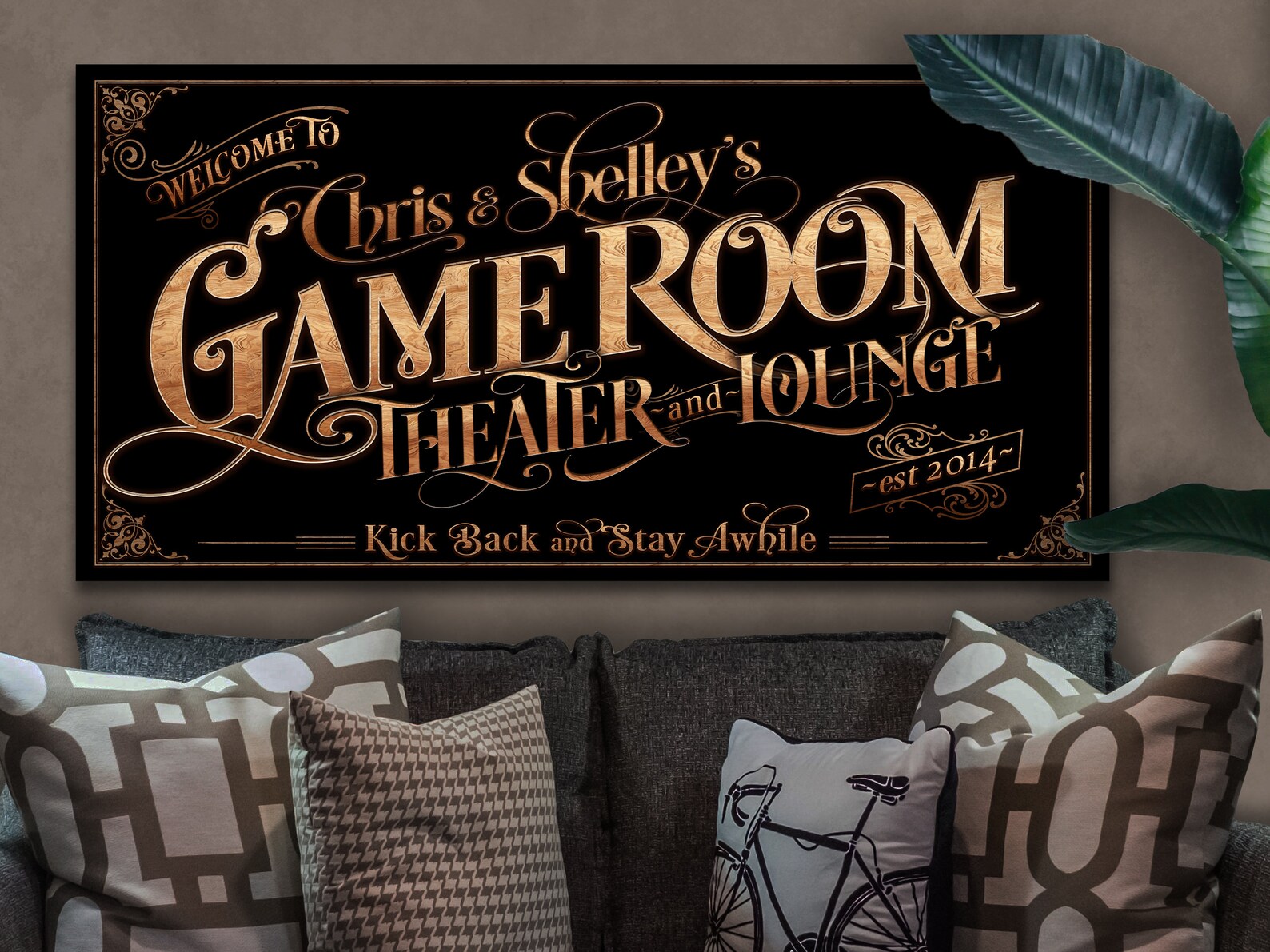 This Game Room and Home Theater Family Name sign offers a modern farmhouse look and feel. I added a wood grain overlay within the fonts and graphic elements. Display this vintage, Game Room, Theater sign and add warmth to any wall. It comes in your choice of metal or canvas!