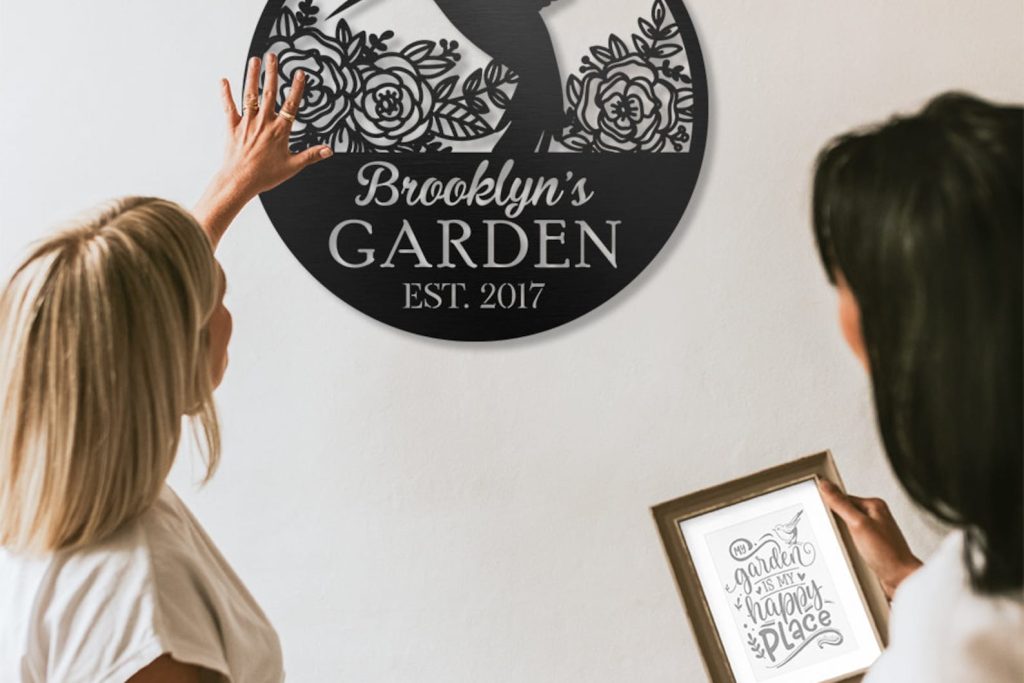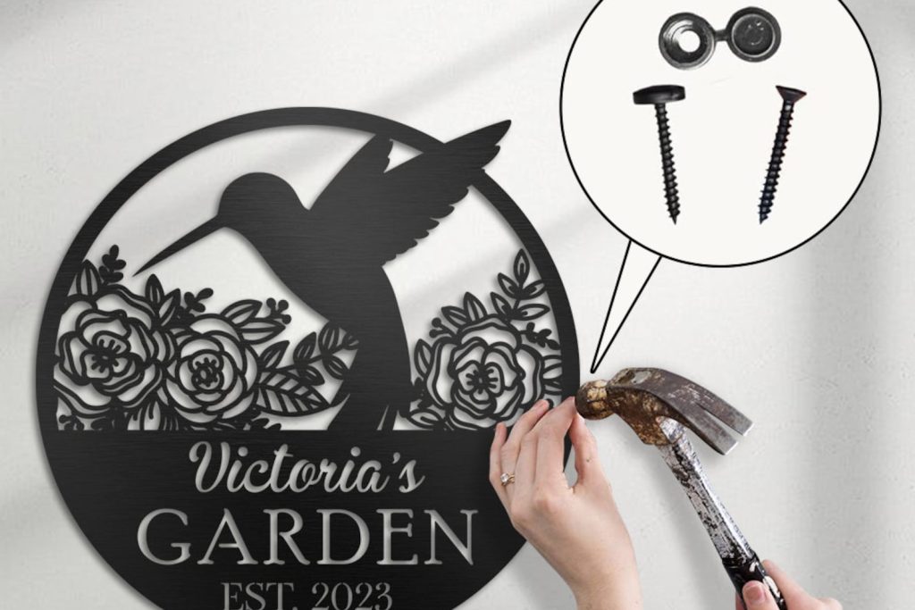 asy to hang — You will receive a name sign with nails and screws. There are holes for you to hang metal signs. You just need to find a suitable place and position it with a hammer. The design of two or more holes can make the name sign more stable, dont worry about it falling or something. The nut can hide the screw without affecting its beauty.
