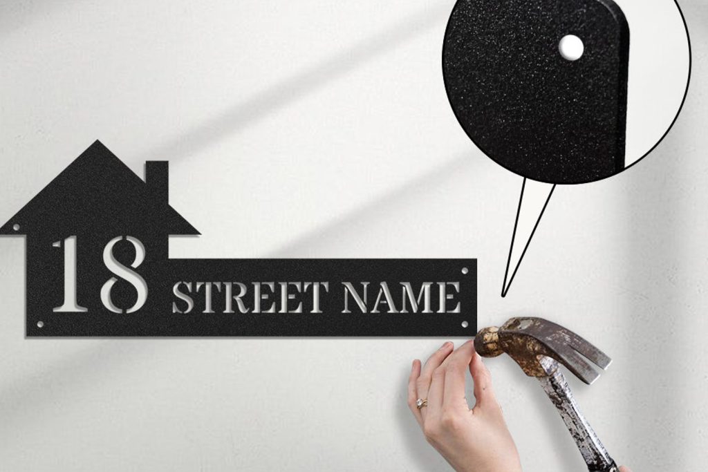 asy to hang — There are holes for you to hang metal signs. You just need to find a suitable place and position it with a hammer. The design of two or more holes can make the name sign more stable, dont worry about it falling or something. The nut can hide the screw without affecting its beauty.