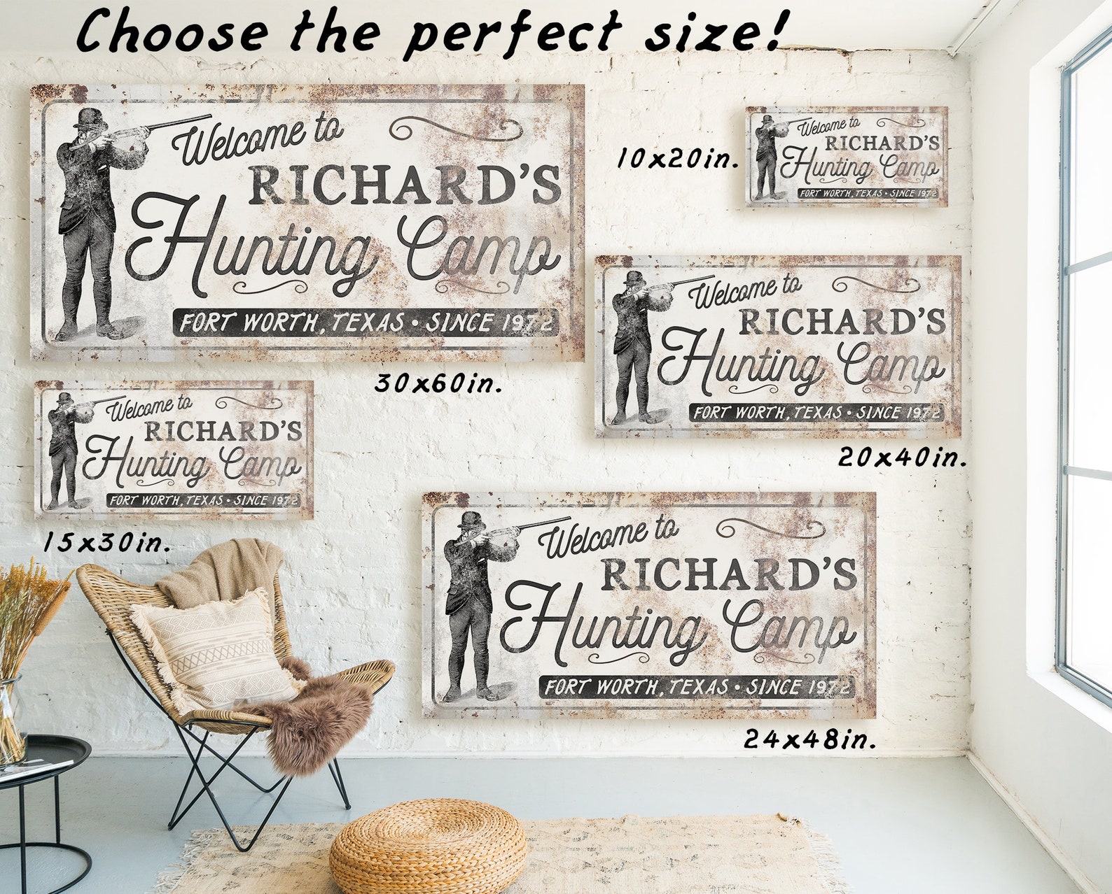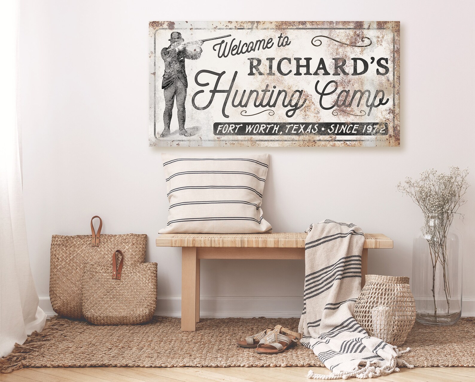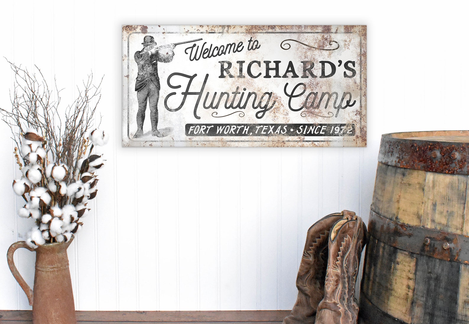 The rustic and weathered textures you see in the artwork will look the same no matter what item you order on. That means metal, wood, and canvas all have the vintage look to them!