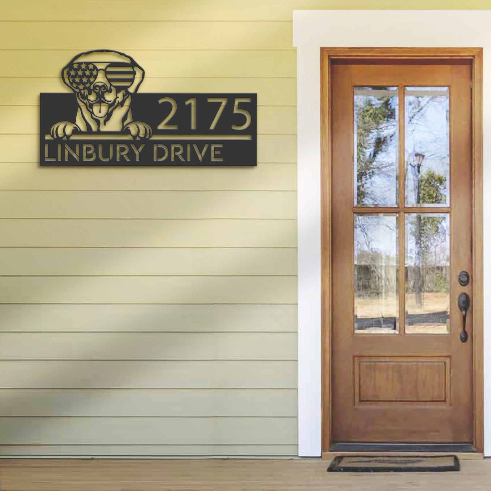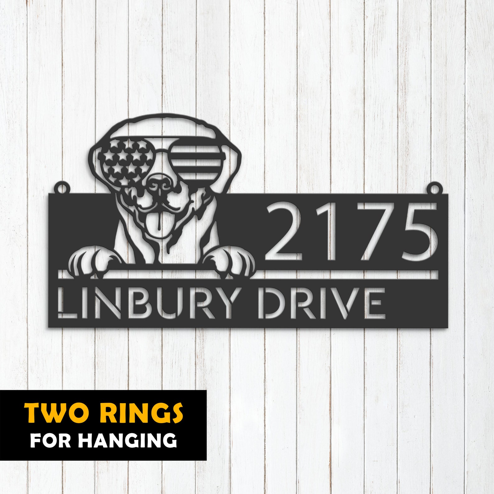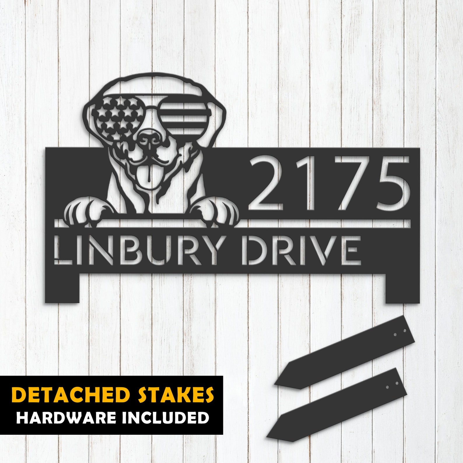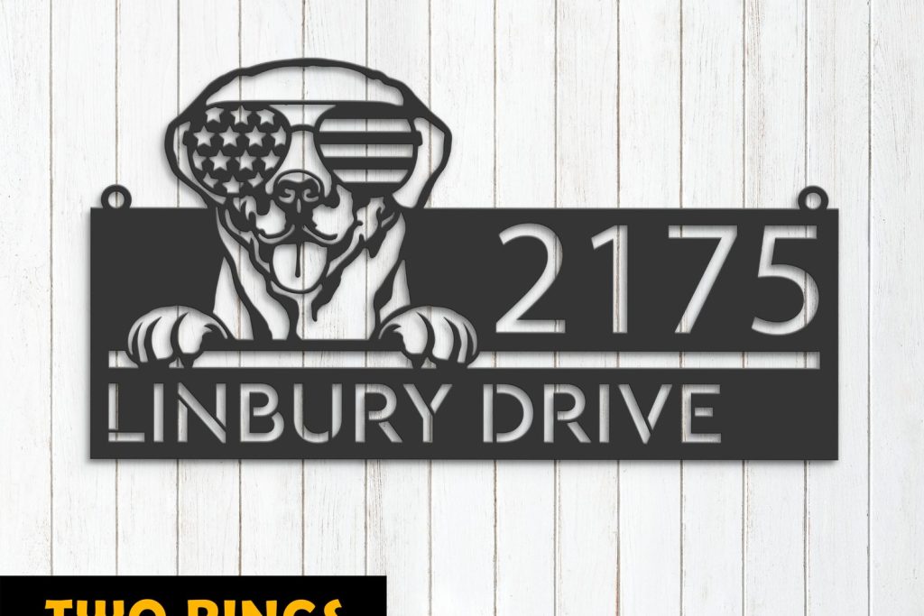 Be the first to review “Personalized Labrador Metal Address Sign – US Flag Glasses”