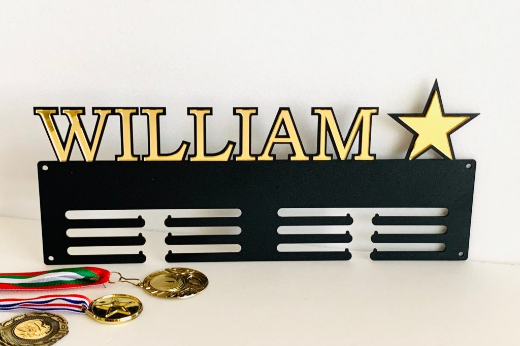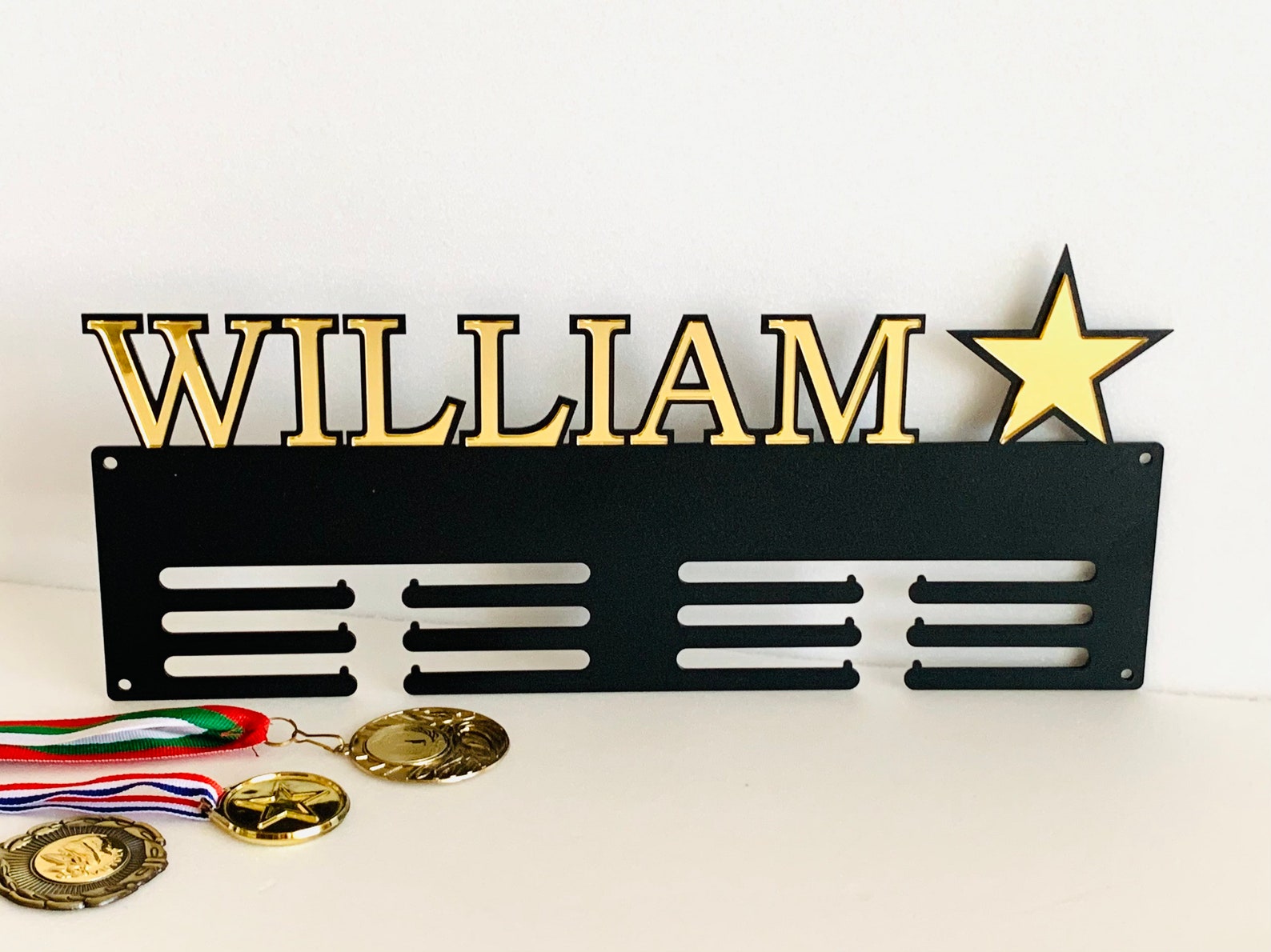This unique luxury personalized medal holder with a custom name and star is the best way to display all that you have been collecting from the championship circuit.