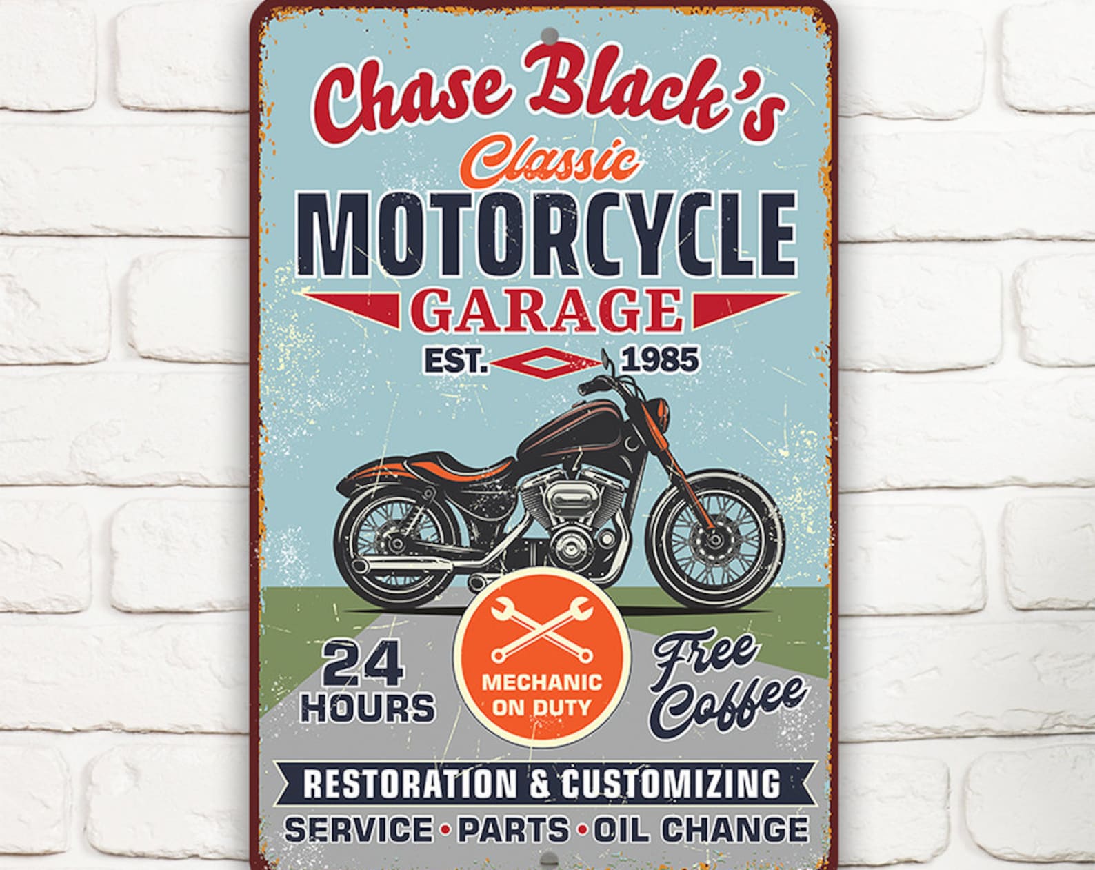 Be the first to review “Personalized Motorcycle Repair Garage Metal Sign – 8×12 or 12×18”