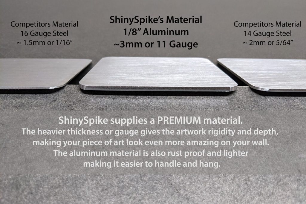 All our artwork is made from Aluminum! We us a 1/8 material which is approximately 3mm thick or similar to an 11-gauge steel. Aluminum offers you a high-quality product that will not rust. It is also lighter and therefore easier to handle and hang on your wall, while still maintaining its strength and rigidity. Each piece is finished with a textured black powder coat to give you a consistent and beautiful finish.