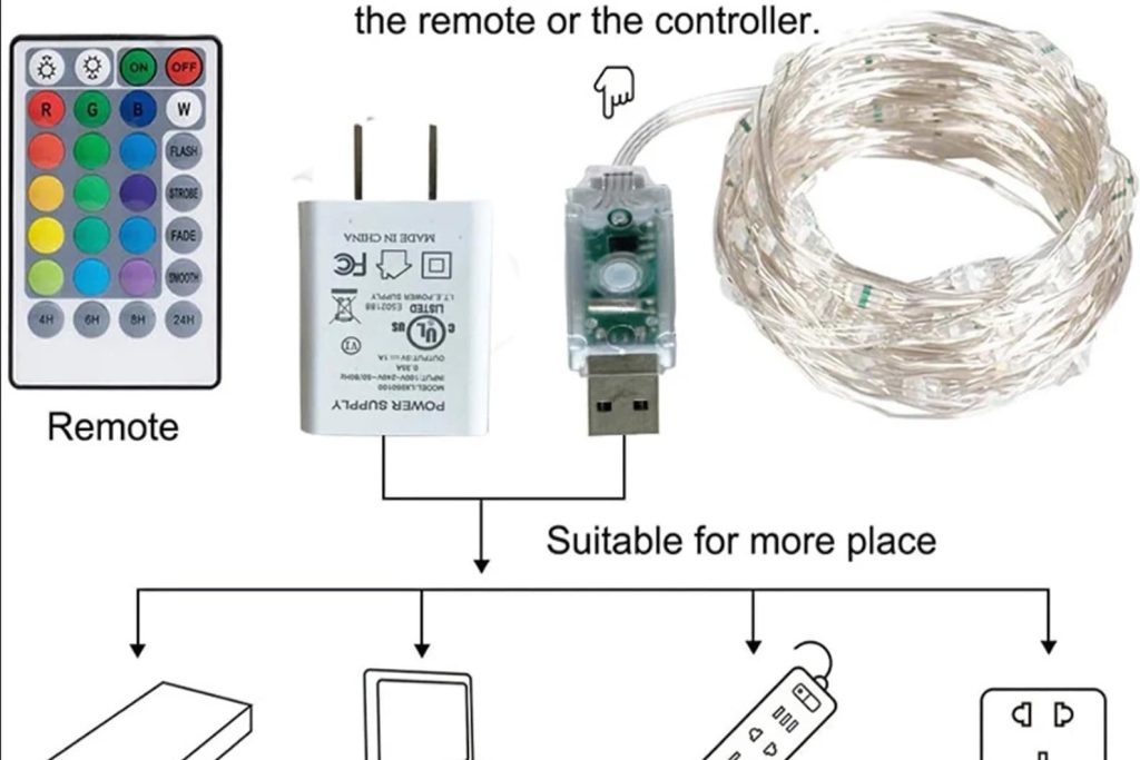 Remote control. You can use the remote control to turn the lights on and off, change the colour to one of 16 vibrant colours, adjust the brightness, cycle through the various colours and set the timer for 6 hours.