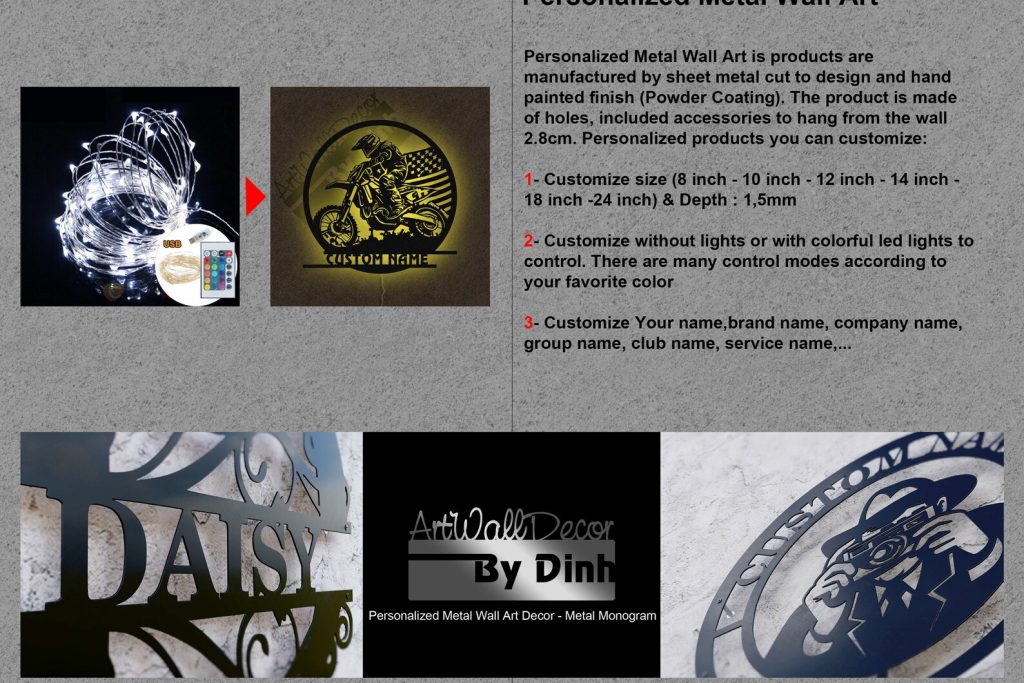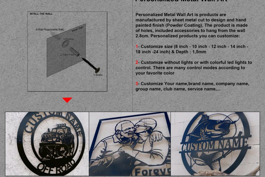 *Personalized LED Light Metal Sign is products are manufactured by sheet metal (Depth : 1,5mm) cut to design and hand painted finish.The product is made of holes, incl accessories to hang from the wall 2.8cm.Personalized products you can customize: