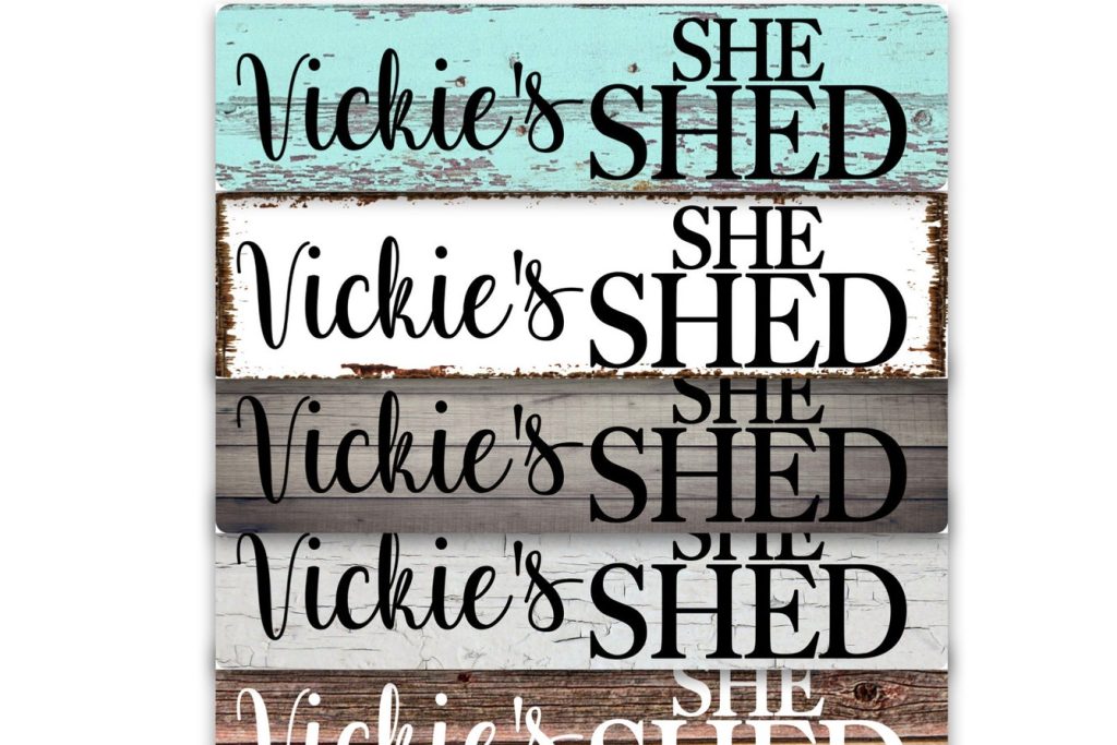Personalized SHE SHED name – choose from backgrounds – Barn wood, Grey Wood, White Crackle, Rusty orTeal wood style backgrounds – Metal Sign Door Plaque – (Note not actual wood or rust so smooth and safe to the touch)