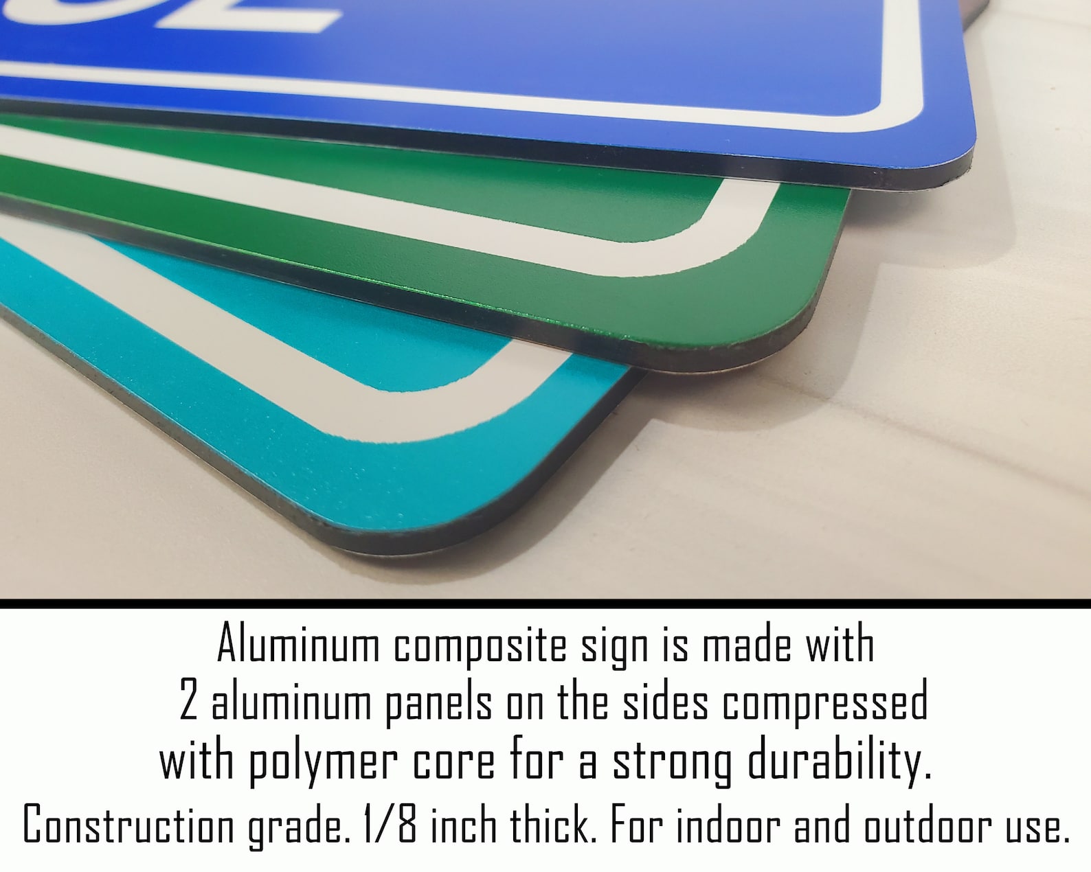 The aluminum composite panel is .125 inch thick. It is comprised of a reinforced synthetic core sandwiched between two sheets of aluminum. This combination is more rigid yet lightweight, making it easy to hang. This sign will not rust. This product is not a decal.