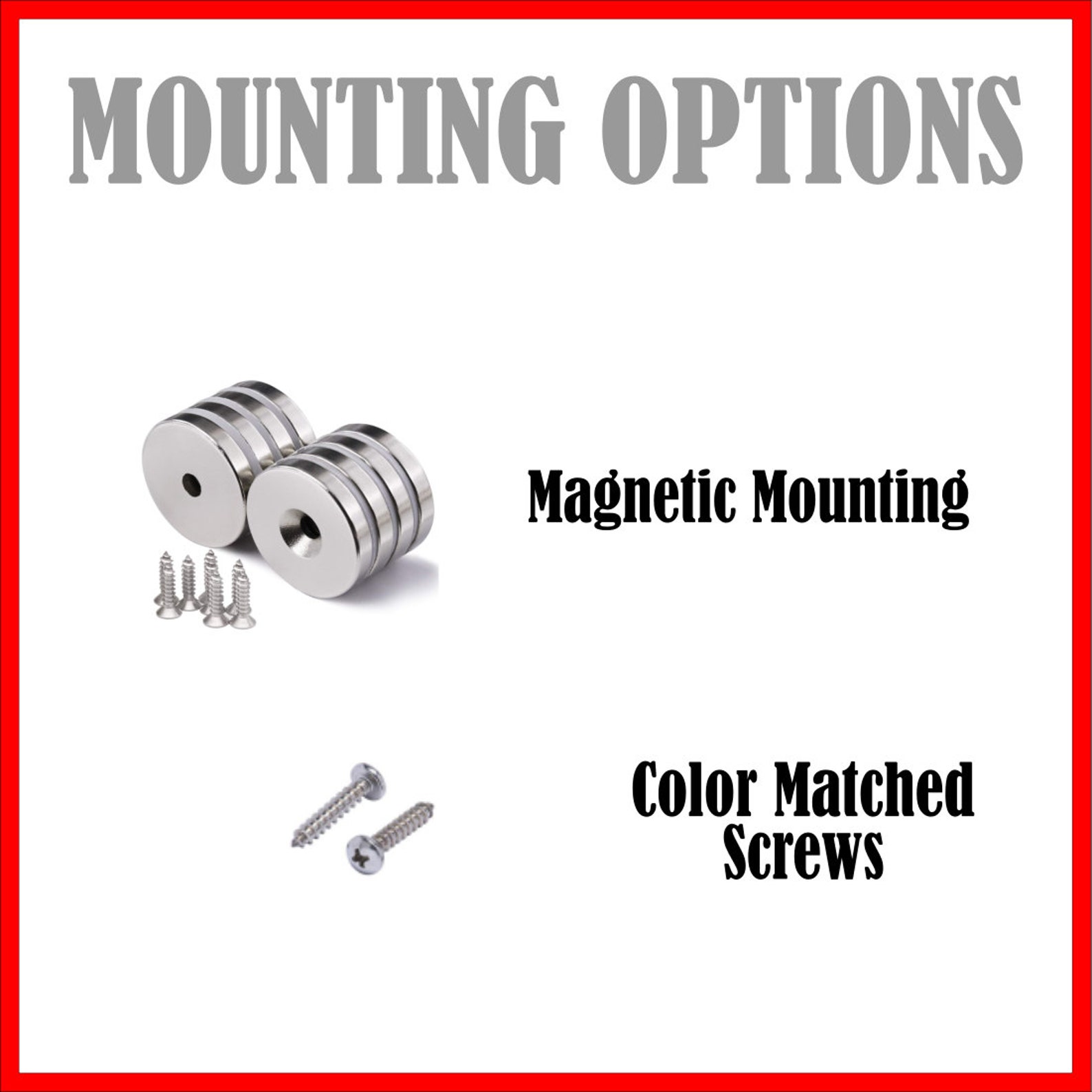 * Magnetic Mount Kit = Rare Earth Cup Style Magnets with Screws Provided. These can be installed on almost any surface and will hold up to 100 lbs. Perfect for attaching metal holiday or seasonal signs. Simply attach the magnet to your surface and change your sign with every season with out damaging or piercing your signs.