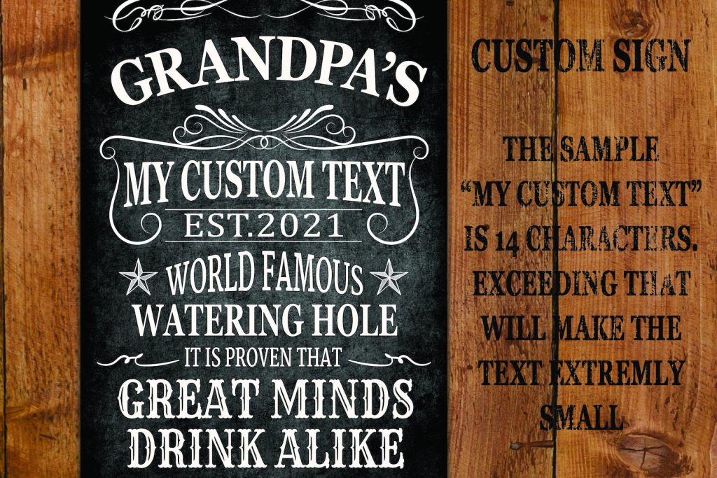3) Enter the bar name and established year in the personalization field. For best results limit the text for the top of the sign to no more than 15 characters. Please INCLUDE the apostrophe S if needed for names. NOTE: If you selected custom location, enter the wording for your location after the bar name. Custom locations limit to 14 characters.