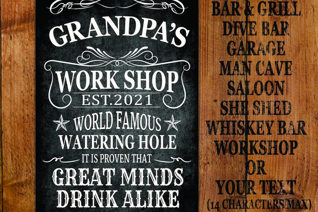 Personalized Black Vintage Style Metal Bar Sign | Great Gift | Customize this sign with your first name, last name or whatever bar name you want. First pick a location–you can use one of our choices or provide your own! Man Cave, Home Bar, Pub, Garage, Tavern, Workshop, She Shack, Game Room or your favorite getaway retreat | Designed with a weathered, antiqued look that will make your special place all yours!