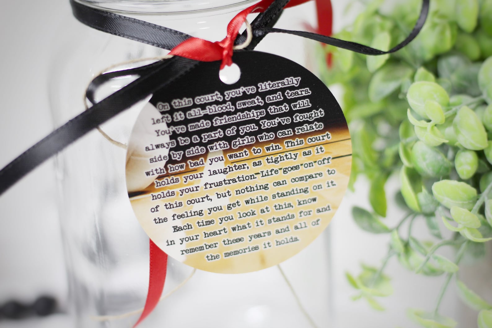 Guys version: "On this court, you9;ve literally left it all–blood, sweat, and tears. You9;ve made friendships that will always be a part of you. You9;ve fought side by side with guys who can relate with how bad you want to win. This court holds your laughter, as tightly as it holds your frustration. Life goes on off of this court, but nothing can compare to the feeling you get while standing on it. Each time you look at this, know in your heart what it stands for and remember these years and all of the memories it holds."