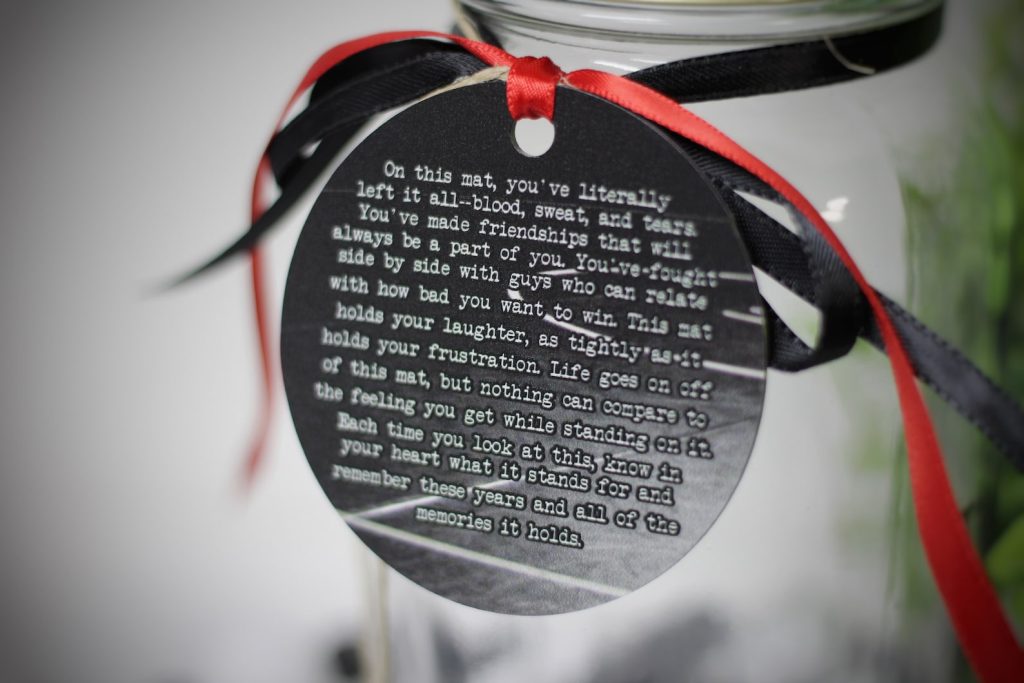 Use this personalized metal tag to attach to a jar with a piece of wrestling mat from your home team9;s gym. Makes a great sentimental gift for senior wrestlers and they9;re perfect for Senior Night at your school. Makes a great decoration for senior graduation party table decor!
