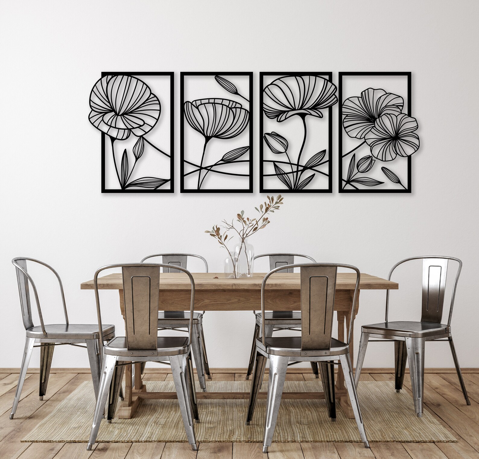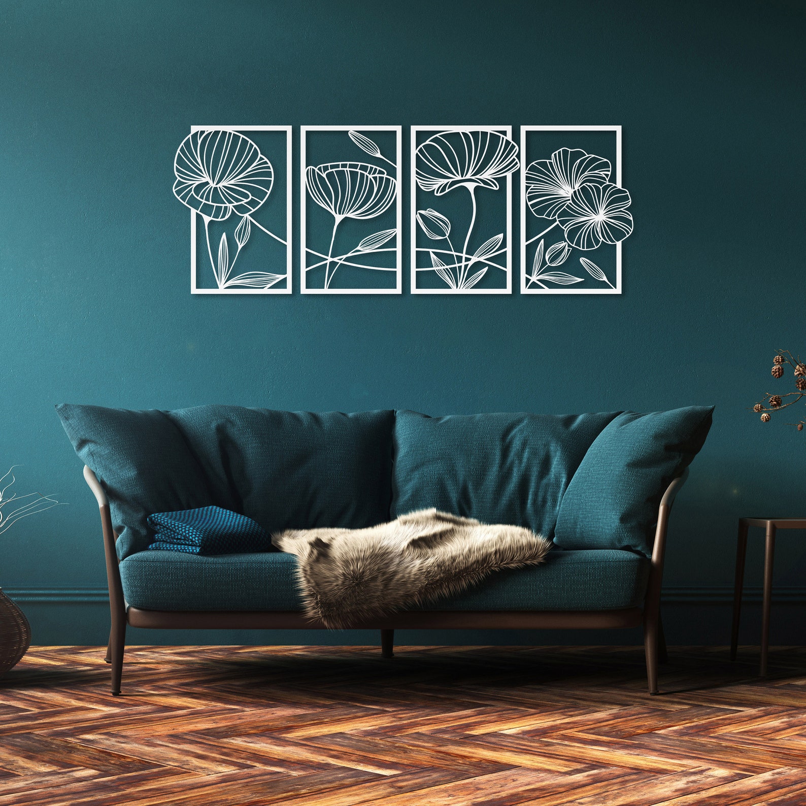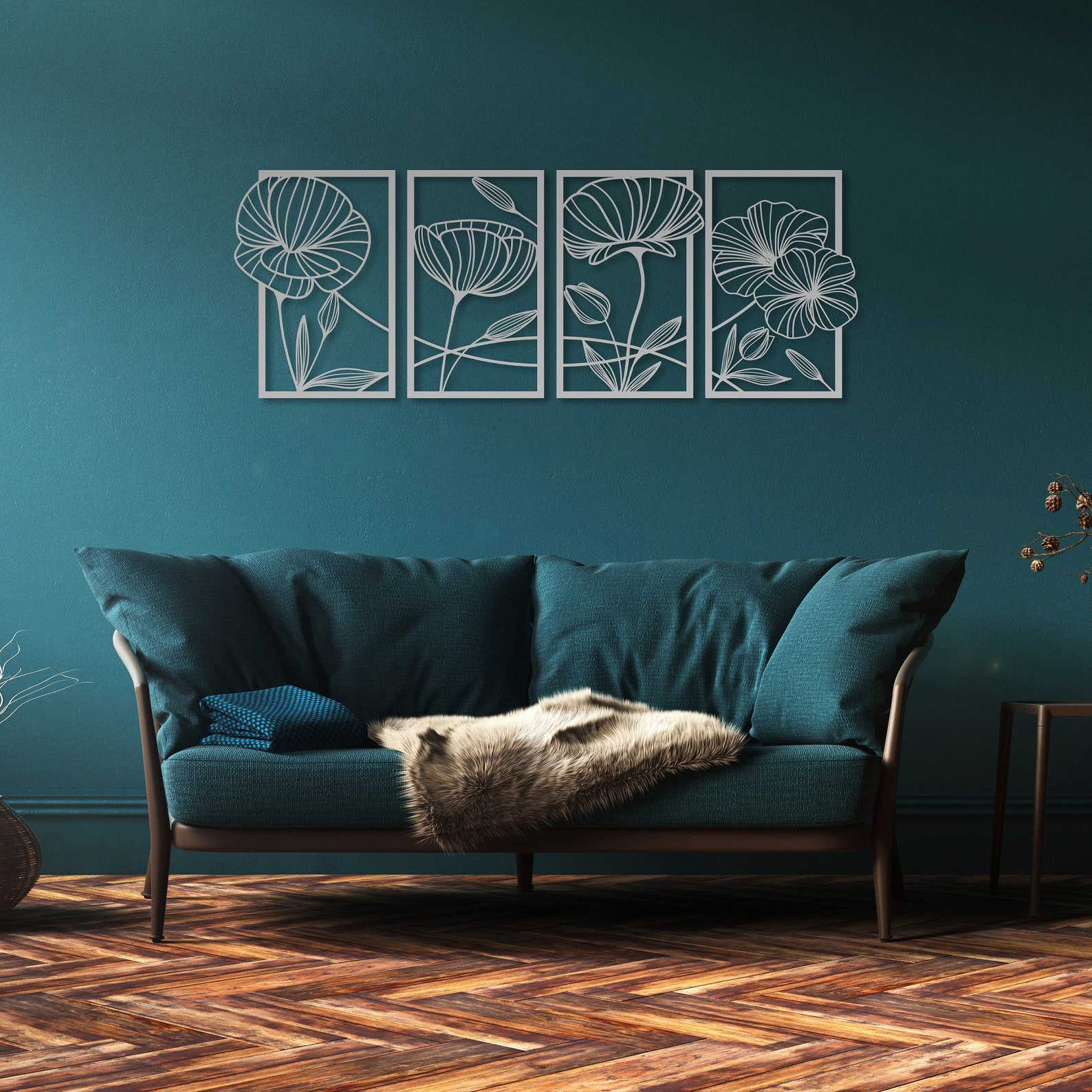 Poppy Flowers 4 Panels, Metal Flower Wall Art, Metal Wall Decor, 4 Pieces Wall Hangings, Metal Wall Art, Home Decoration, Tree Decor