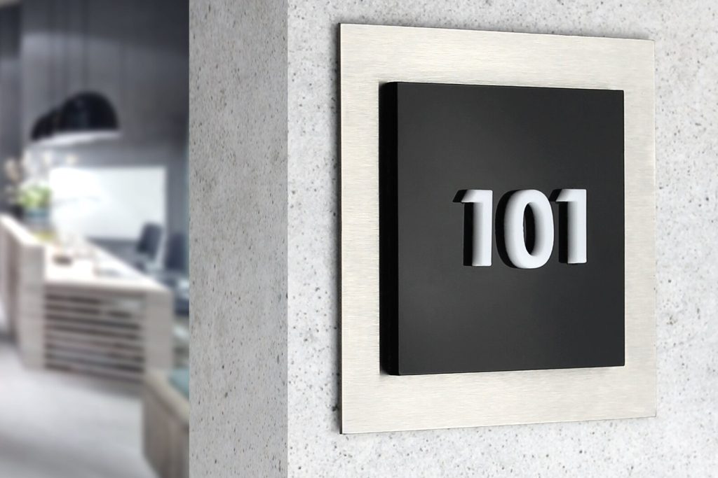 – The unit number signs are made of three layers: one stainless steel next color and milk acrylic.