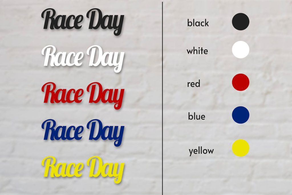 Introducing our Metal Race Day Sign, the perfect addition to any contemporary home decor! This handmade sign is laser cut from metal and comes in 5 different color options: black, white, red, blue, and yellow. It is available in 4 different sizes, ranging from 16 inches to 55 inches, making it a versatile piece for any space.