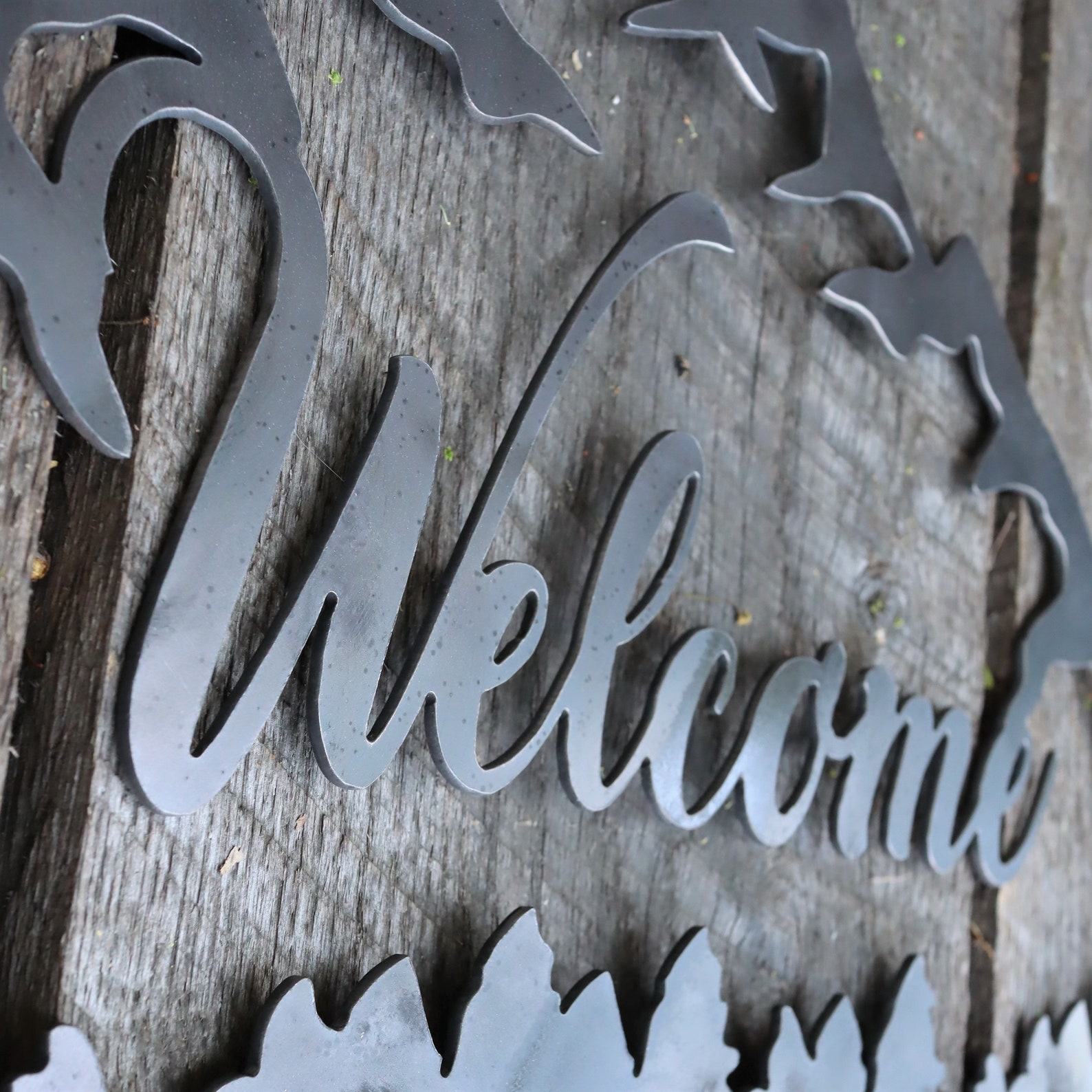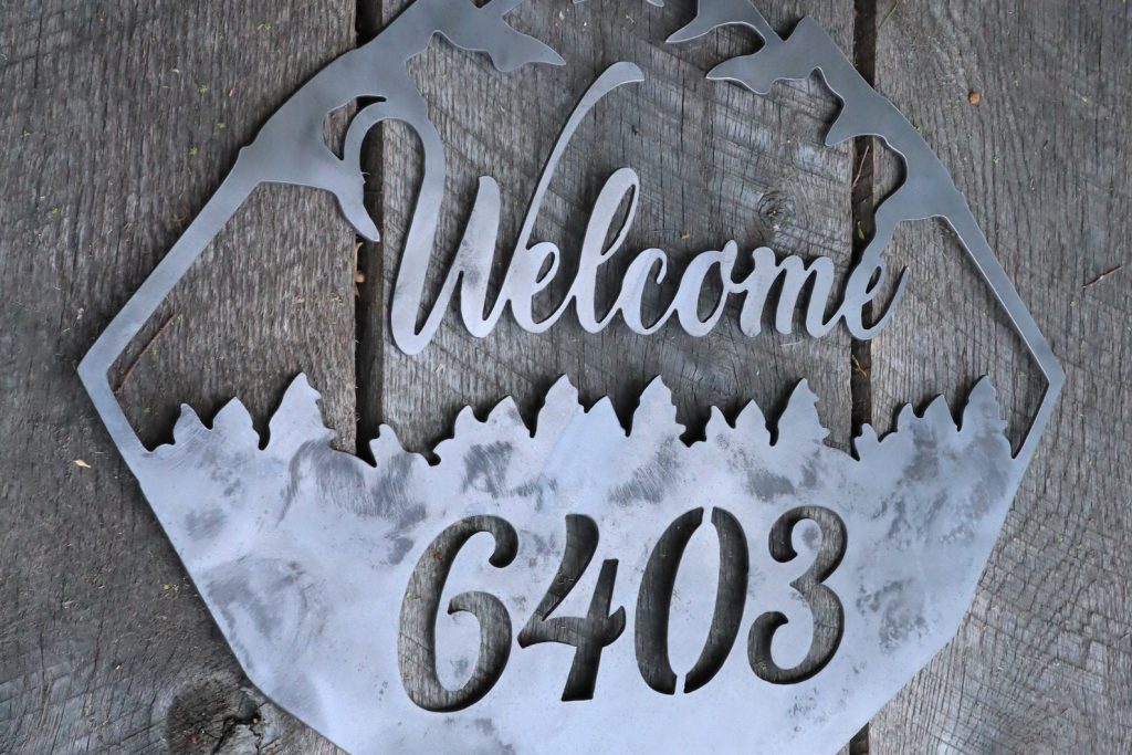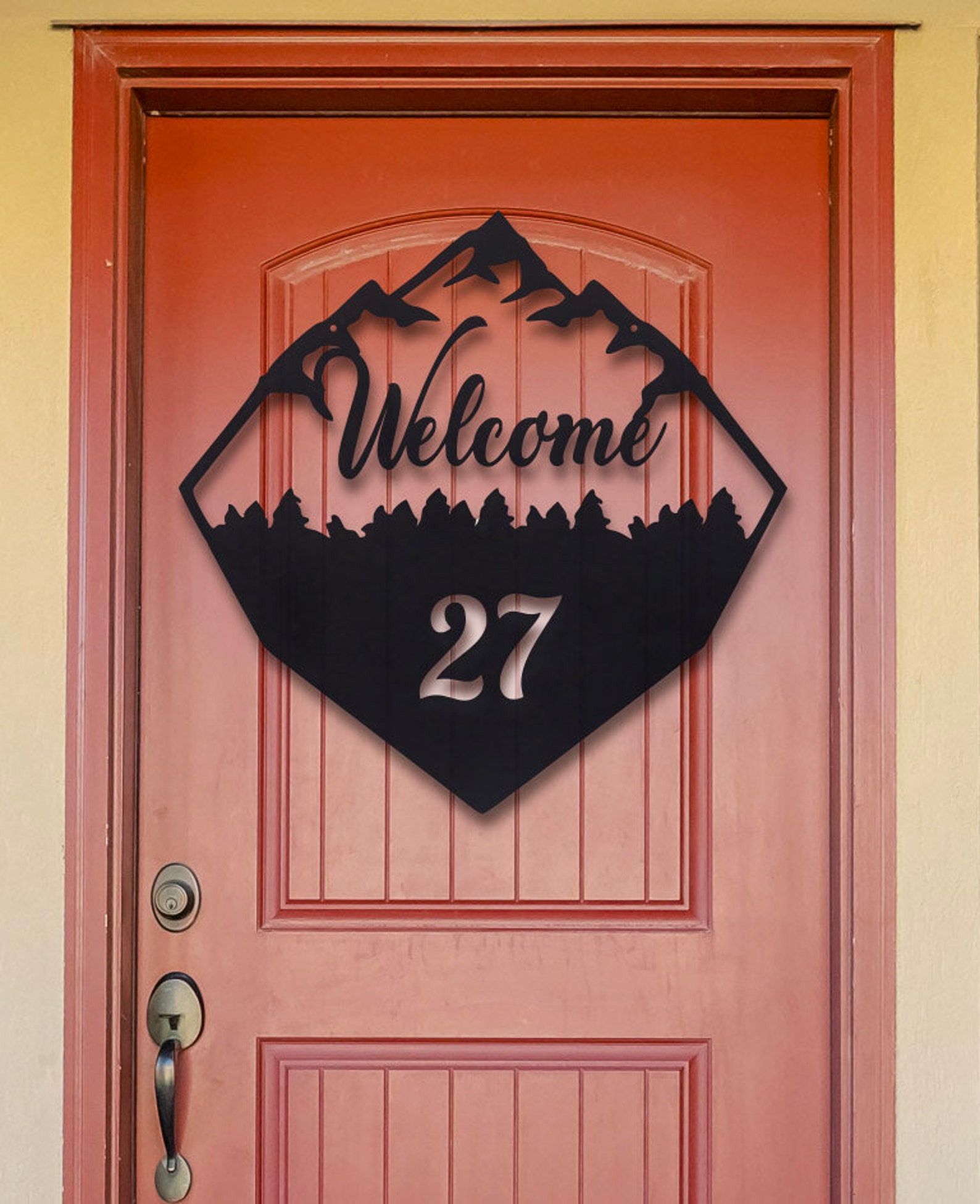 Use this rustic welcome sign to display your house number in a scene of majestic mountains and lush woods. This metal address sign has a sophisticated look with a rustic feel that will add character and charm to any home.