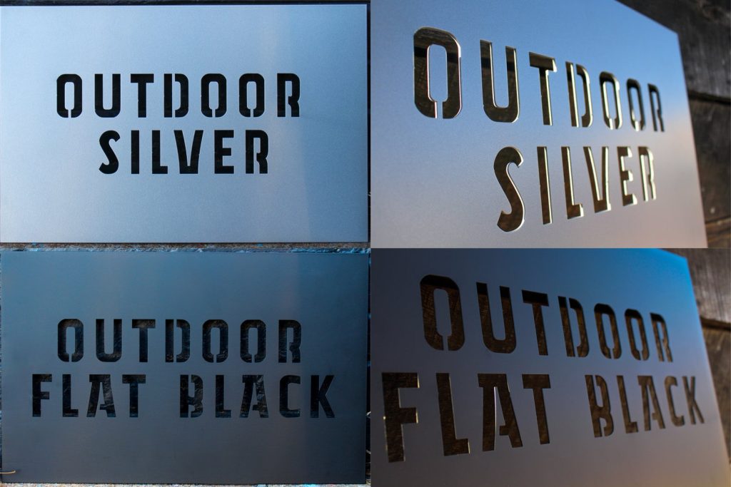 OUTDOOR FLAT BLACK – The Outdoor Flat Black finish is a matte black powder coat. This UV protected finish will protect the steel in the toughest conditions including outside in wet and salty environments. Powder coat is a thick industrial coating that is VOC free and holds up for many years.