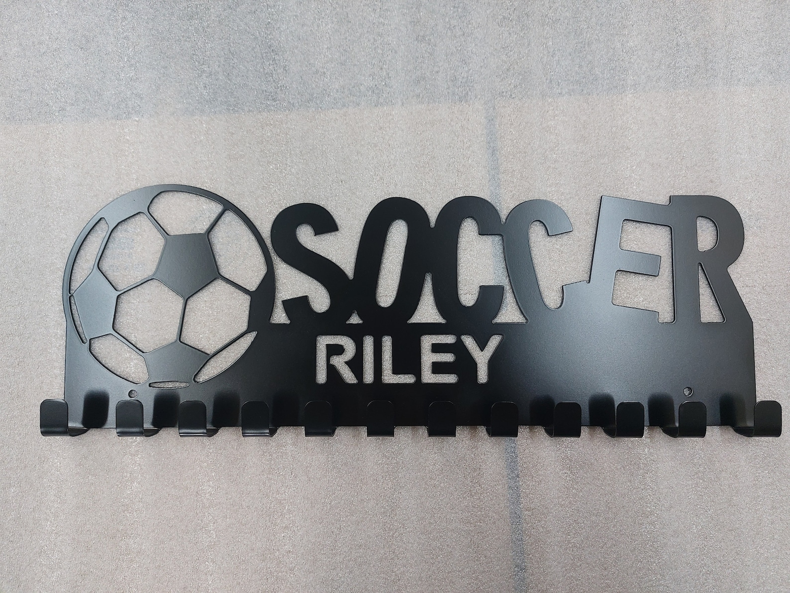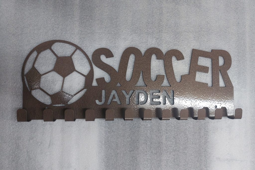 Display your favorite athletes medals with this customizable soccer medal holder. It is cut from heavy duty 16-gauge steel, so it wont be weighed down with all their awards! This product comes with 12 medal hooks with 2 mounting holes 16" on center for secure mounting. Select the paint color that best matches your athlete9;s personality. If you do not see your preferred color available, message me.