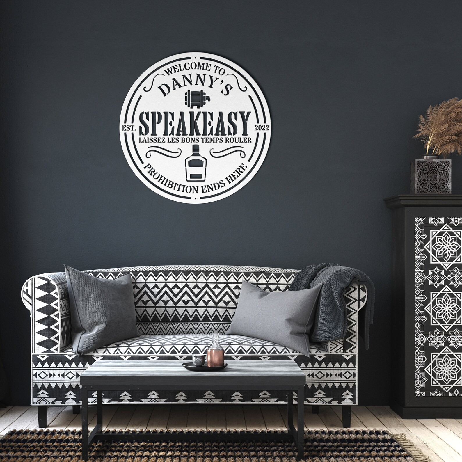 Transform your home into a private oasis of indulgence with this personalized speakeasy home bar sign. Crafted with meticulous attention to detail, this metal sign captures the allure and mystique of the Prohibition-era speakeasies. Customize it with your desired name or message, adding a touch of personalization that reflects your unique style and taste. Hang it above your home bar or entrance to create an atmosphere reminiscent of secret gatherings and hidden delights. The vintage-inspired design, complete with ornate lettering and art deco accents, adds an air of sophistication to any space. Whether you9;re hosting intimate gatherings or simply seeking a cozy retreat, this personalized speakeasy home bar sign sets the stage for unforgettable moments and clandestine celebrations.