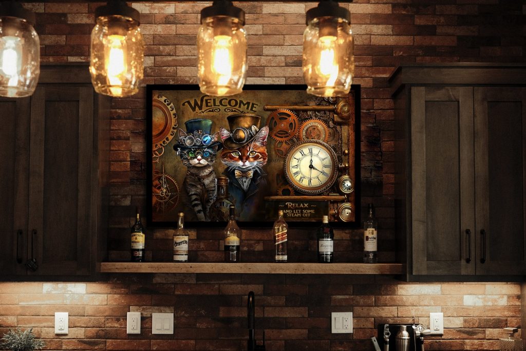 This Steampunk Kitty Cat Welcome Sign makes a great gift for that special person or even yourself. Display this vintage steampunk sign anywhere in your home. It adds warmth and humor to any wall.