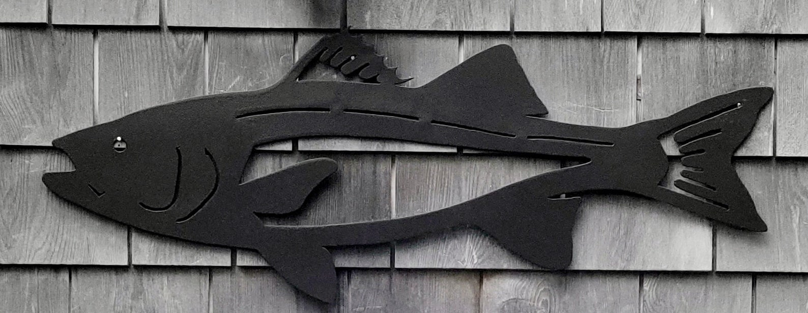 This is the Striped Bass also called Atlantic striped bass, striper, linesider, rock or rockfish. The striper is cut from 16ga steel. All the features are plasma cut out. The upper fins, tail and gill slits were also plasma cut. The whole fish is then painted with a hammered paint. The hammered paint finish mimics the skin texture. We have two sizes to choose from a 20 inch and 30 inch.