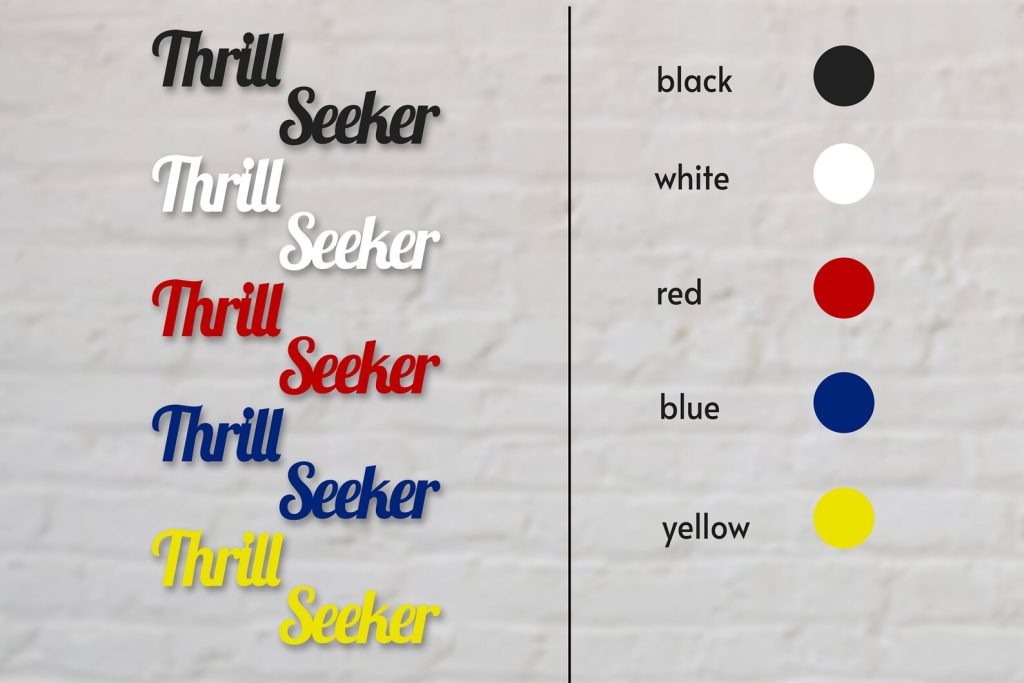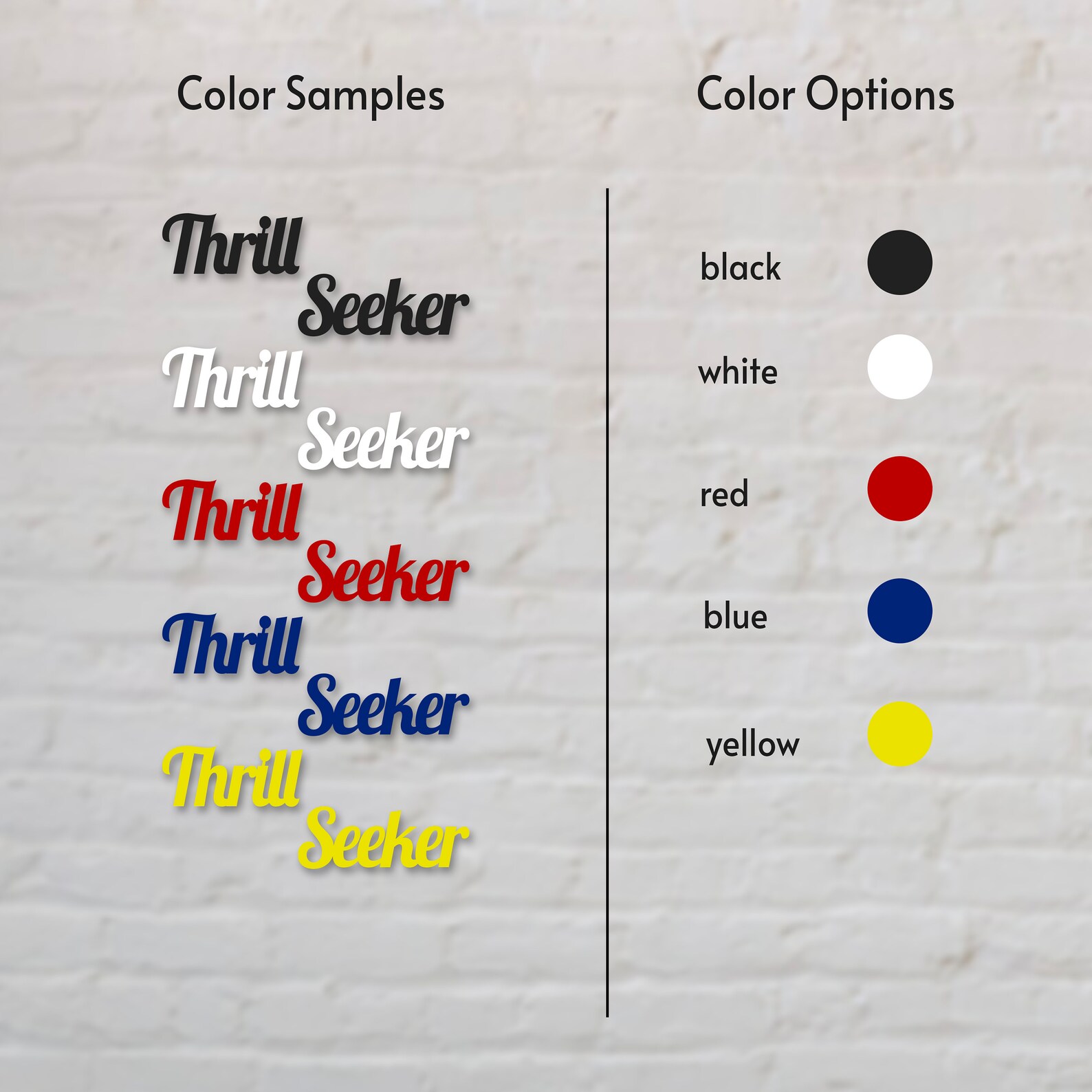 As a handmade product, the Metal Thrill Seeker Sign is laser cut with precision and care. It is available in four different sizes, ranging from 16 inches to 55 inches, and five different colors, including black, white, red, blue, and yellow.