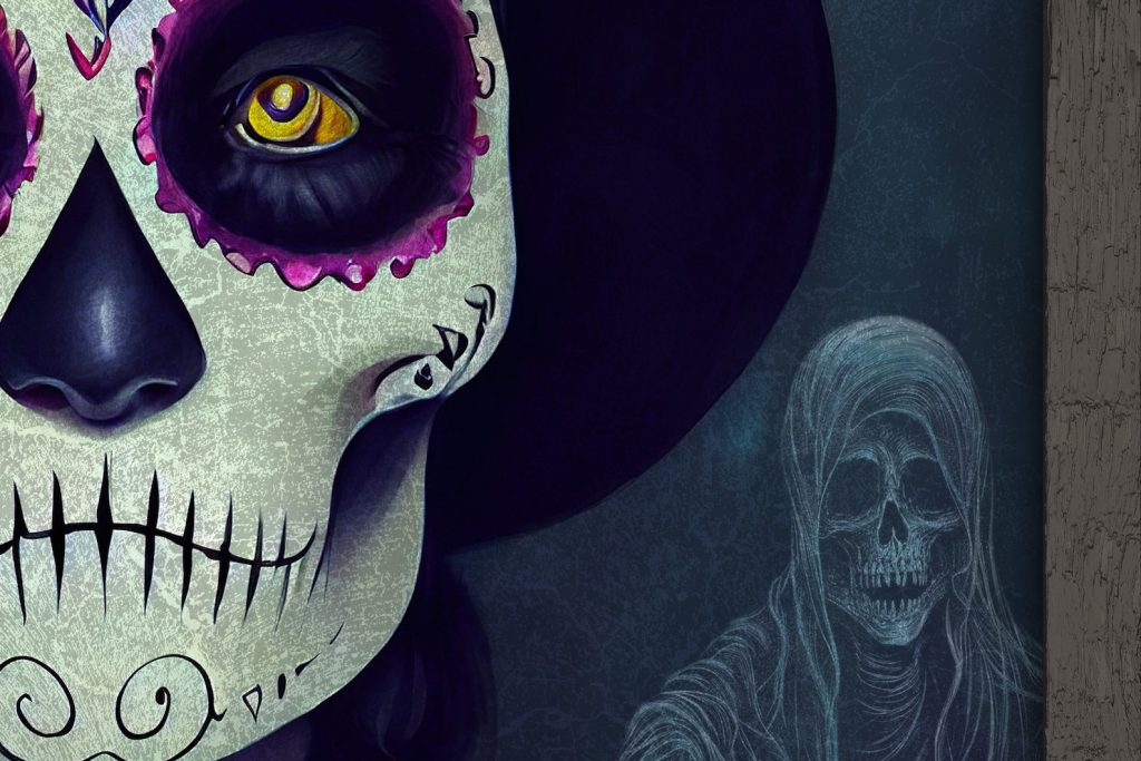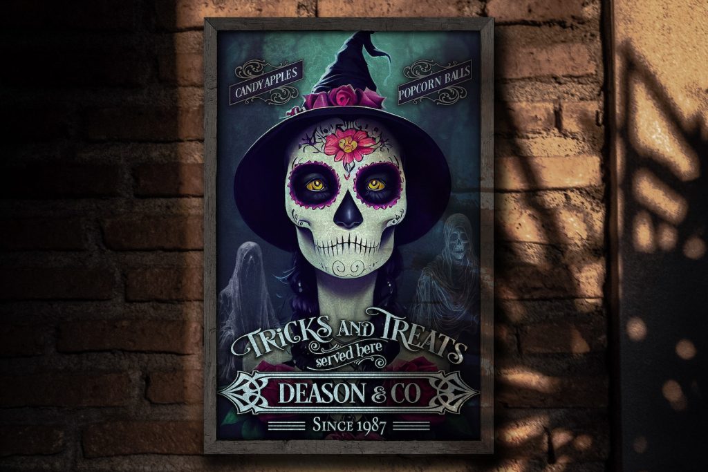 Be the first to review “Tricks and Treats Halloween Sign – Sugar Skull Witch, Creepy Halloween Ghost Sign”