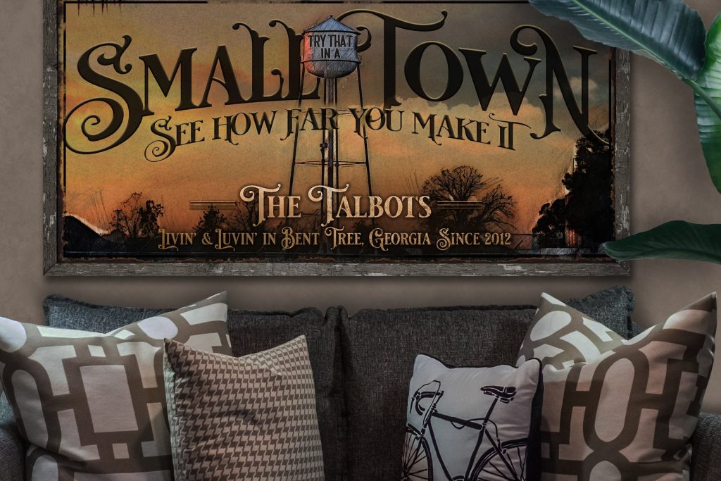 This personalized Small Town Sign offers a warm/distressed look and feel. I will customize this Try That in a Small Town sign by integrating your custom text into the vintage art you see. This makes a great gift for that special person or even yourself. Display this vintage small town sign anywhere in your home. It adds warmth to any wall.