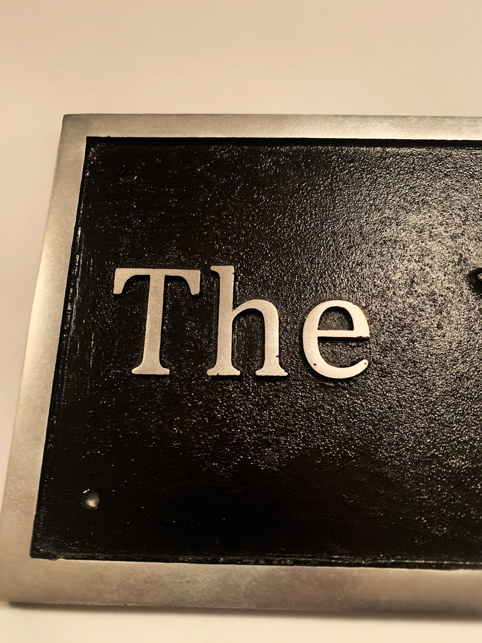 A large house name plaque, cast with hot aluminium using a master carvers own unique design for a Tudor rose as the feature piece. A border surrounds the plaque with the name situated above and/or below the rose.